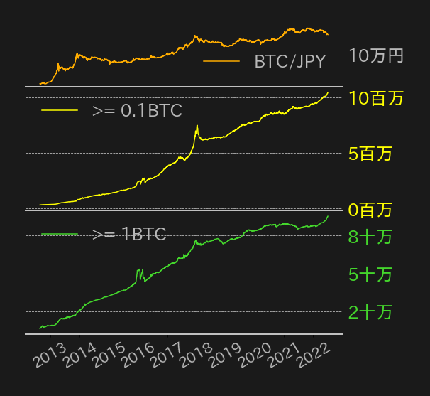 週末にはステーブルコインを発行するCircleのビジネスモデルが崩壊寸前と主張する情報も出回ったが、真偽不明ということもあり市場の反応は極めて限定的だった。半年以上、相場は下落トレンドを継続しており、ここにきてやや売り疲れの可能性も指摘できるか。ただ、少量のBTCを保有するアドレスは記録的な増加を見せており、これを潜在的な売り圧力の増加と捉えるか少額HODLERが増えたと捉えるか判断に悩む(第2図)。