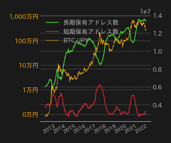 足元では短期的にBTCを保有するアドレスも増えていることを鑑みると、短期で少量のBTCを保有する市場参加者が増加したことになるが、相場の下落局面でこうしたことが起きるのは珍しい(第3図)。目立った例外としては、2014年の弱気相場の終盤に短期BTC保有アドレス数が一時的に反発していたことがあり、これは売りが一巡して相場の下げ止まる予兆と捉えられるか。
