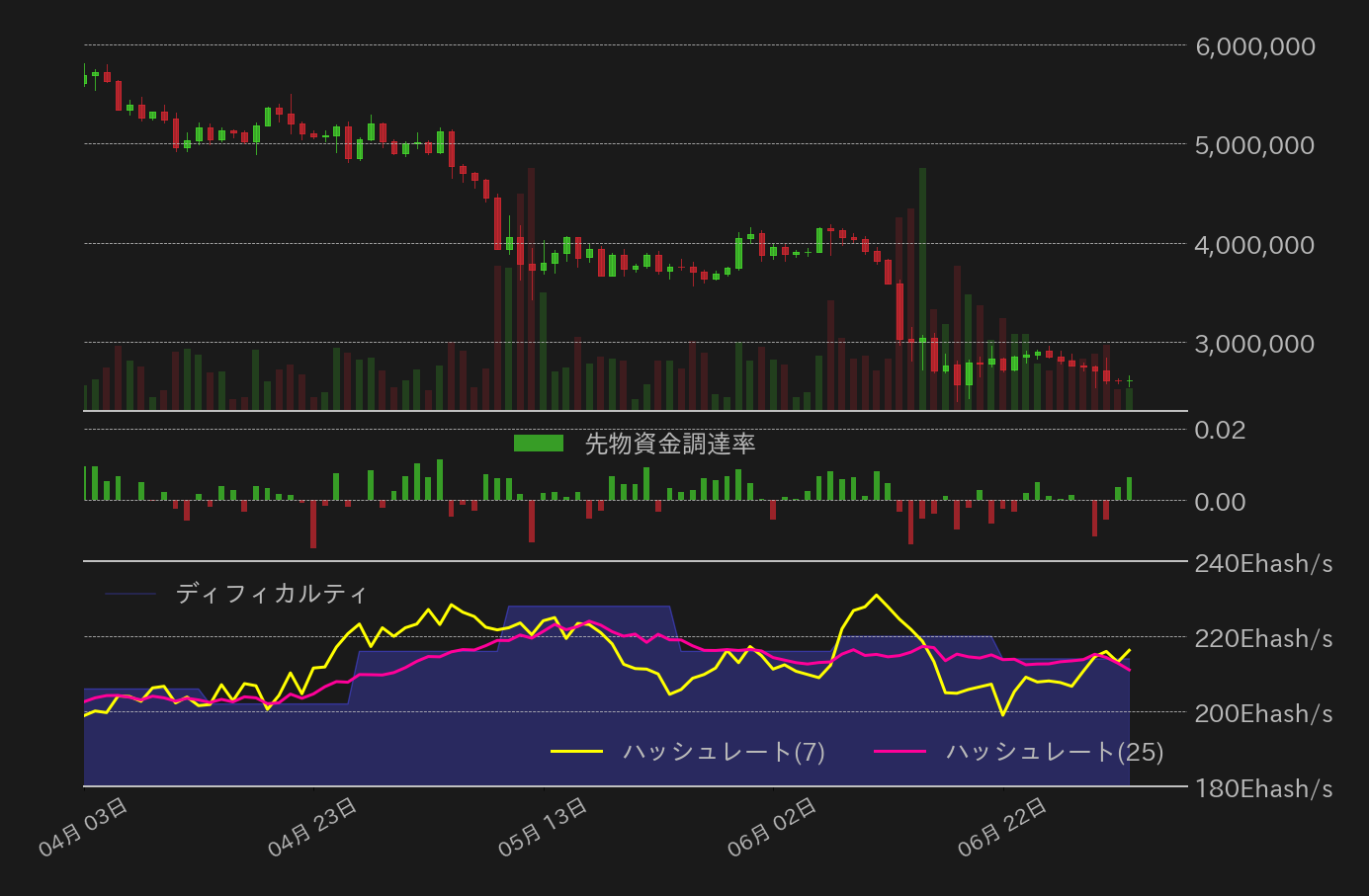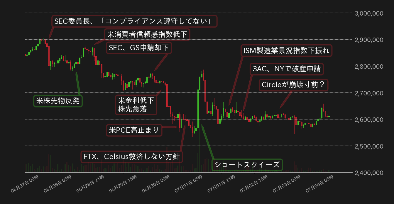 週前半の相場下落によりショートポジションが積み上がったのを狙ってか、週後半にはショートスクイーズが起こり相場は280万円にタッチしたが、すかさず戻り売りが入り上げ幅をほぼ掻き消した。ただ週末にかけては、ISM製造業景況指数の下振れや、スリーアローキャピタル(3AC)のNYでの破産申請等、再び悪材料が続出したが、相場は260万円周辺で揉み合いに終始した。