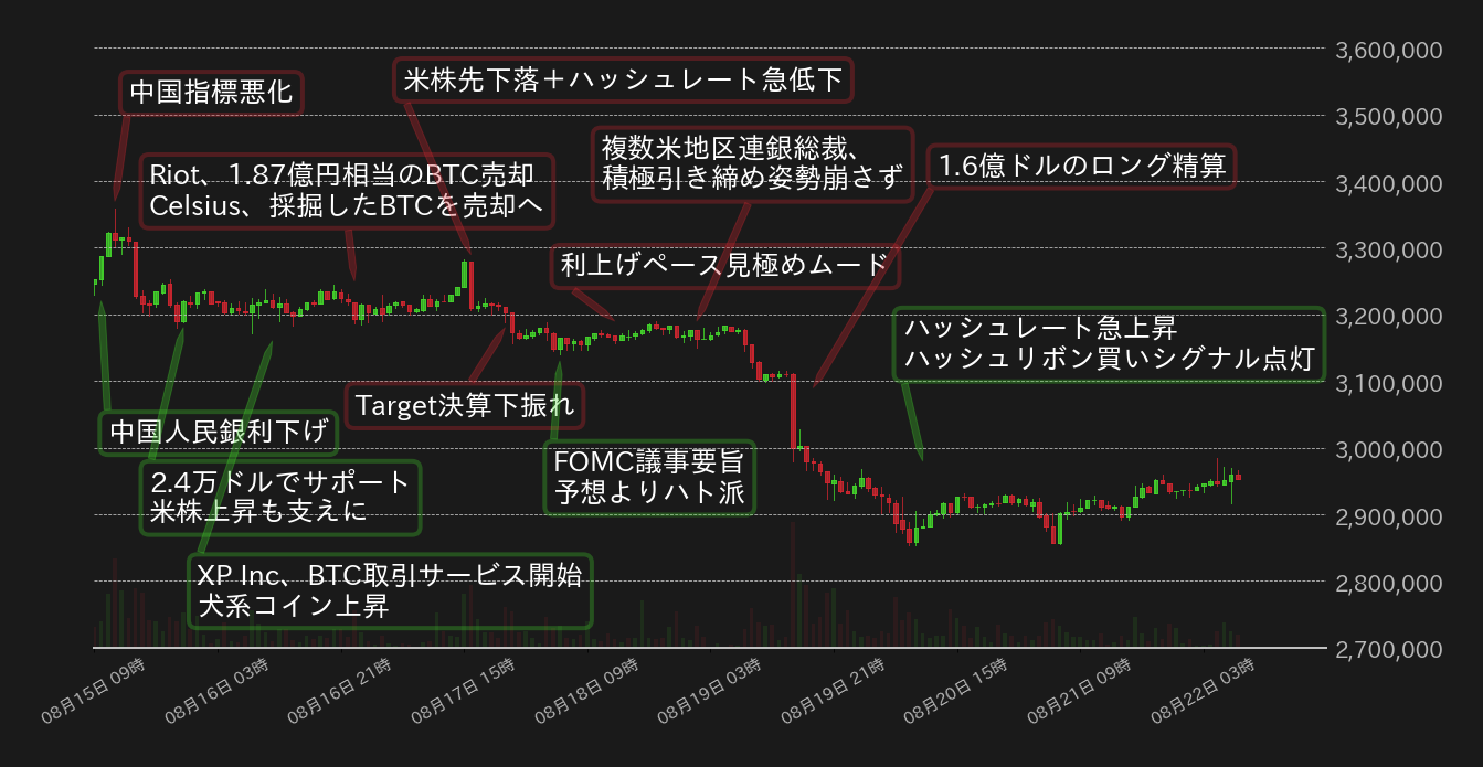 中国人民銀行の想定外の利下げに反応し、330万円台回復から始まった先週のBTC対円相場だったが、その後は三段安を演じ、上値の重い展開が続いた。特に週後半にかけては、市場が米連邦準備制度理事会(FRB)による政策金利引き上げペースを見極めようとする中、セントルイス連銀のブラード総裁が9月に3度目の75ベーシスポイント(bp)利上げ支持を表明すると、ミネアポリス連銀のカシュカリ総裁やカンザスシティ連銀のジョージ総裁からもタカ派的な発言が相次いだ。これを受け、BTCは320万円周辺から安値を広げる展開となり、19日には1.6億ドル(≒220億円)相当のロングポジションが清算され、相場は300万円を割り込んだ。