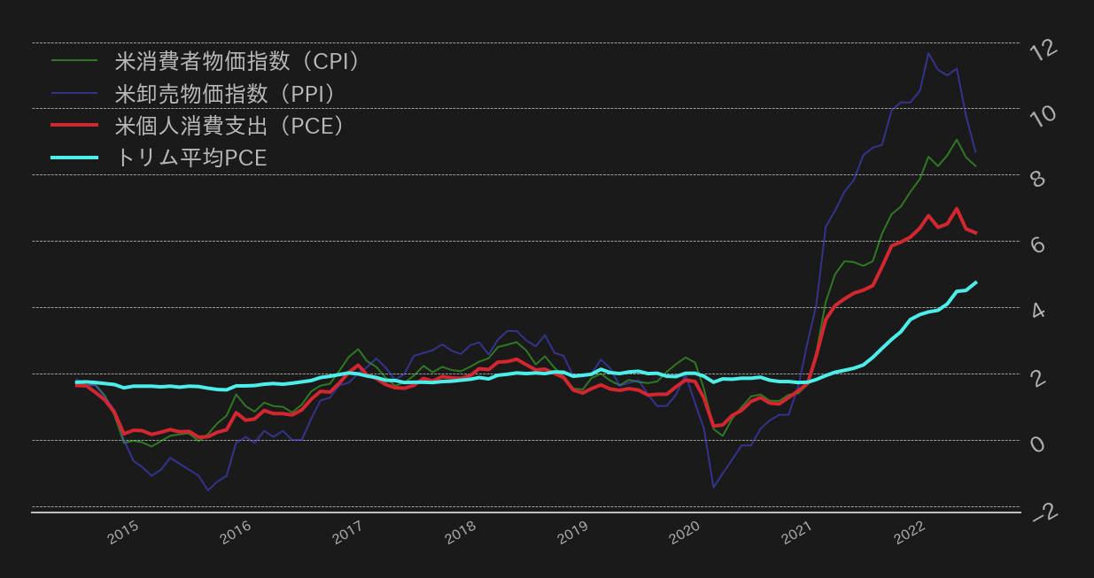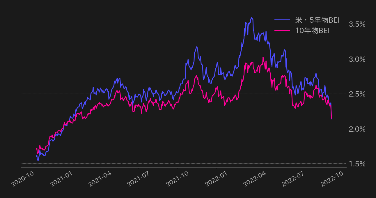 一方、FRBによる積極的な利上げ継続を見込み、米国の期待インフレ率(BEI)は一段と低下し、5年物BEIと10年物BEIの逆転がおよそ1年9カ月ぶりに解消された。先週も指摘の通り、市場は長期のインフレより目先のインフレが高くなることを織り込んでいたが、こうした歪みが解消された。BEIの差が大きく開いた今年の3月から利上げペース加速を示唆し始めたことから、中長期BEIの逆転解消でFRBメンバーの姿勢に変化が出始めるか注視したい。