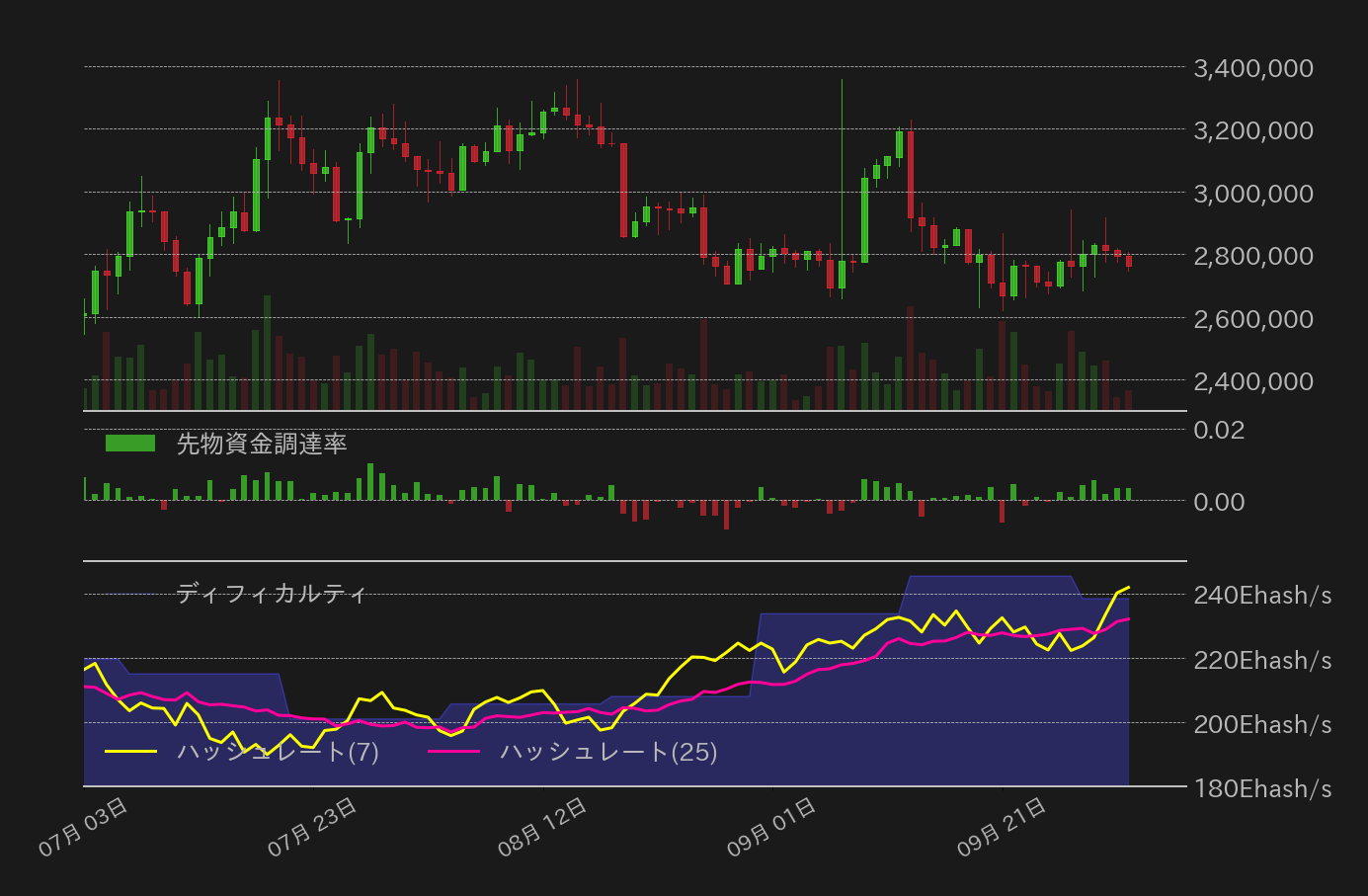 こうした中でビットコインのハッシュレートは再び水準を切り上げている。相場復調の先行シグナルともなってきたハッシュレートの復調だが、相場が復調しない状態で2ヶ月ほどマイニングの競争率が上昇し続けている状態は、マイナーの収益率の観点から相場への影響も懸念される。現状では、マイナーから取引所へのBTC送金に異常な動きは確認されないが、そろそろマイナーのアドレス動向にも目配りした方が良さそうだ。