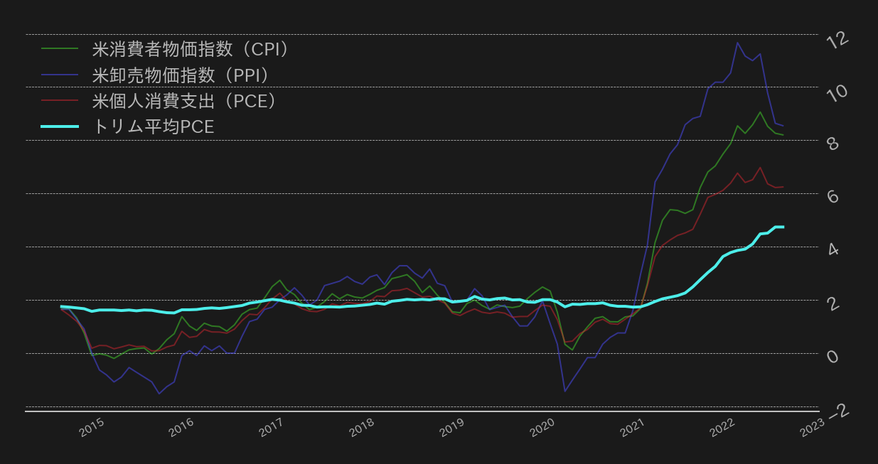 9月の米PCEはヘッドラインが月次と年次いずれも変化がなかった一方、食品とエネルギーを除外したコアPCEは前年同月比で8月の4.9%から5.1%に加速した。しかし、PCEインフレの中長期的なトレンド指標となるトリム平均PCEインフレ率は、8月の4.7%から横ばいとなった他(第2図)、年率換算した1カ月ベースでは6.0%から4.3%と、伸びの顕著な鈍化が見られた。