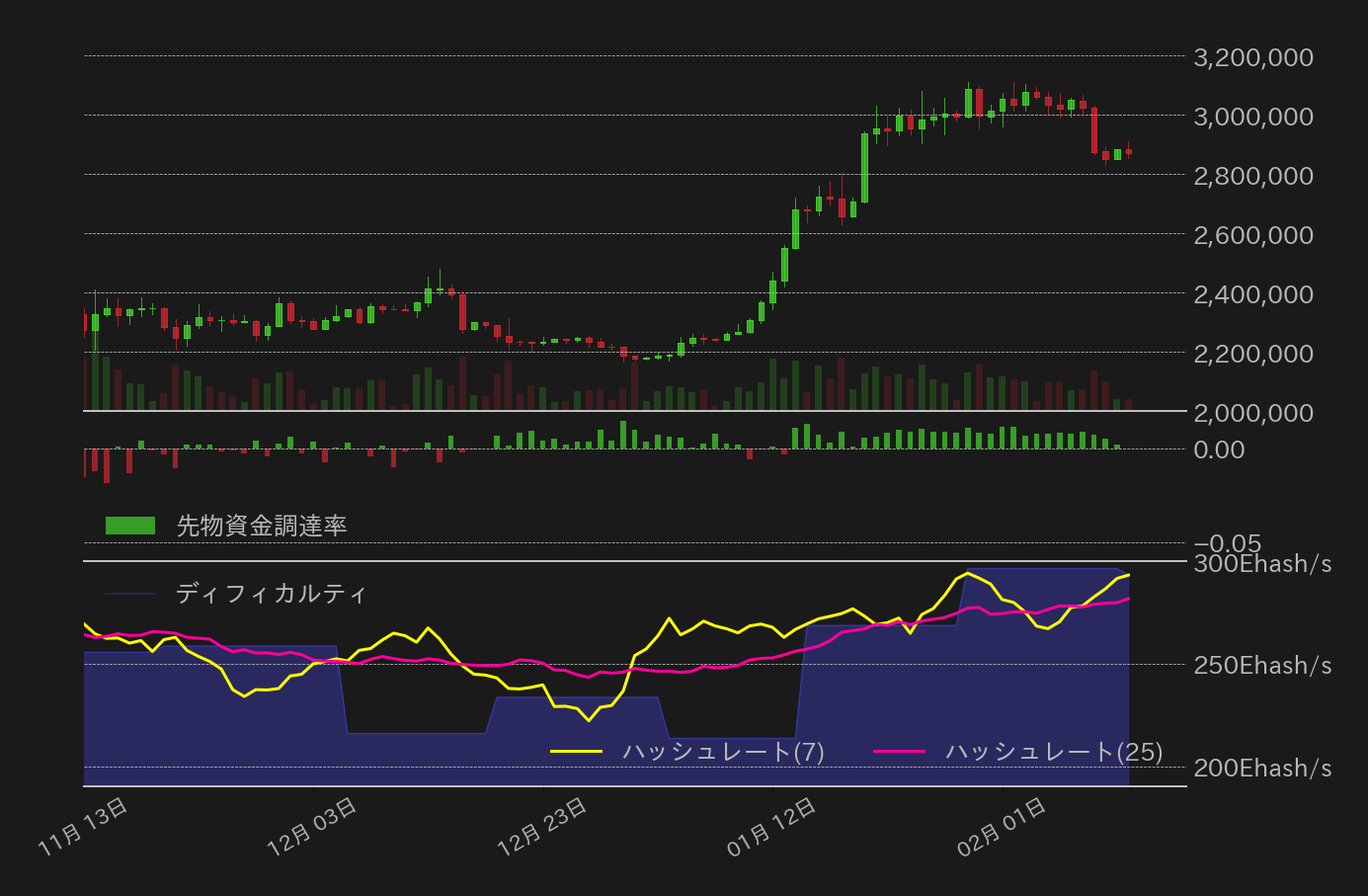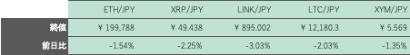 一方、ドル建てで昨年11月高値(21,500ドル)周辺となる同水準で相場は下げ止まると、ボラティリティの落ち着きやすい週末はジリ高に転じた。昨晩には、相場が290万円まで戻す場面もあったが、ドージコイン(DOGE)を筆頭にアルトコイン相場の下げに連れてやや上値を重くし、足元では280万円台中盤まで押している。
