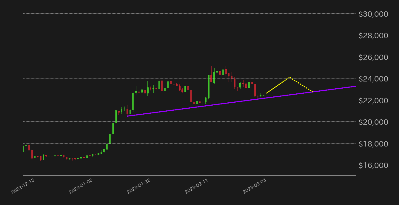 幸いなことに、3日に米供給管理協会(ISM)が発表した2月の米サービス業同行調査レポートでは、PMIと支払価格指数が前月から僅かに低下した。また、景気やインフレの粘り強さを示す昨今の指標が一時的か否かを見極めようとするムードがこの日の米国債利回りを押し下げ、株価を押し上げた。BTC相場はサービス業PMI通過後に反発に失敗したものの、22,200ドル(≒301.7万円)近辺で下げ止まり、週末も同水準で底堅く推移した。