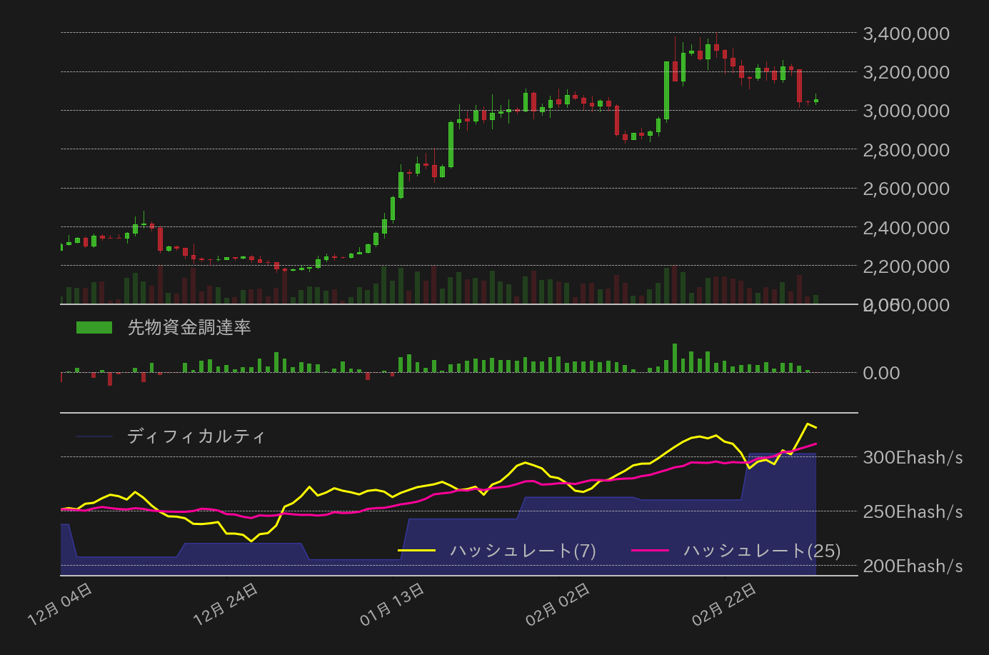 2月27日〜3月5日のビットコイン(BTC)対円相場の週足終値は、前週比159,657円(4.96%)安の3,057,065円と2週続落した。
