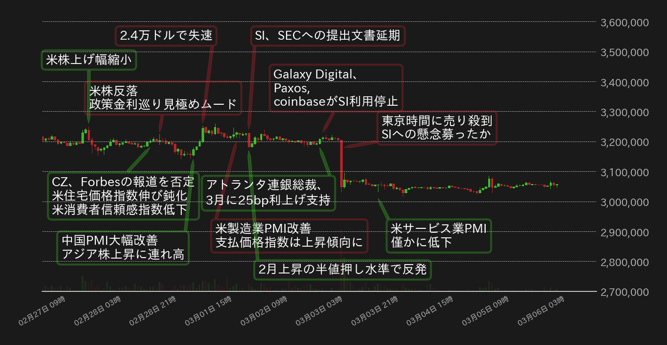 320万円を挟み込み揉み合いが続いていた先週のBTC相場だったが、米銀行持株会社シルバーゲート・キャピタルが1日、米証券取引委員会(SEC)への年次報告書(Form 10-k)提出延期を申請したことを契機に、コインベース、パクソス、ギャラクシー・デジタルと言った名立たる暗号資産(仮想通貨)関連企業が同社との提携関係を解消、或いは縮小を次々と発表すると、3日東京時間にBTC相場は一段安を演じ、320万円から302万円まで急落した。