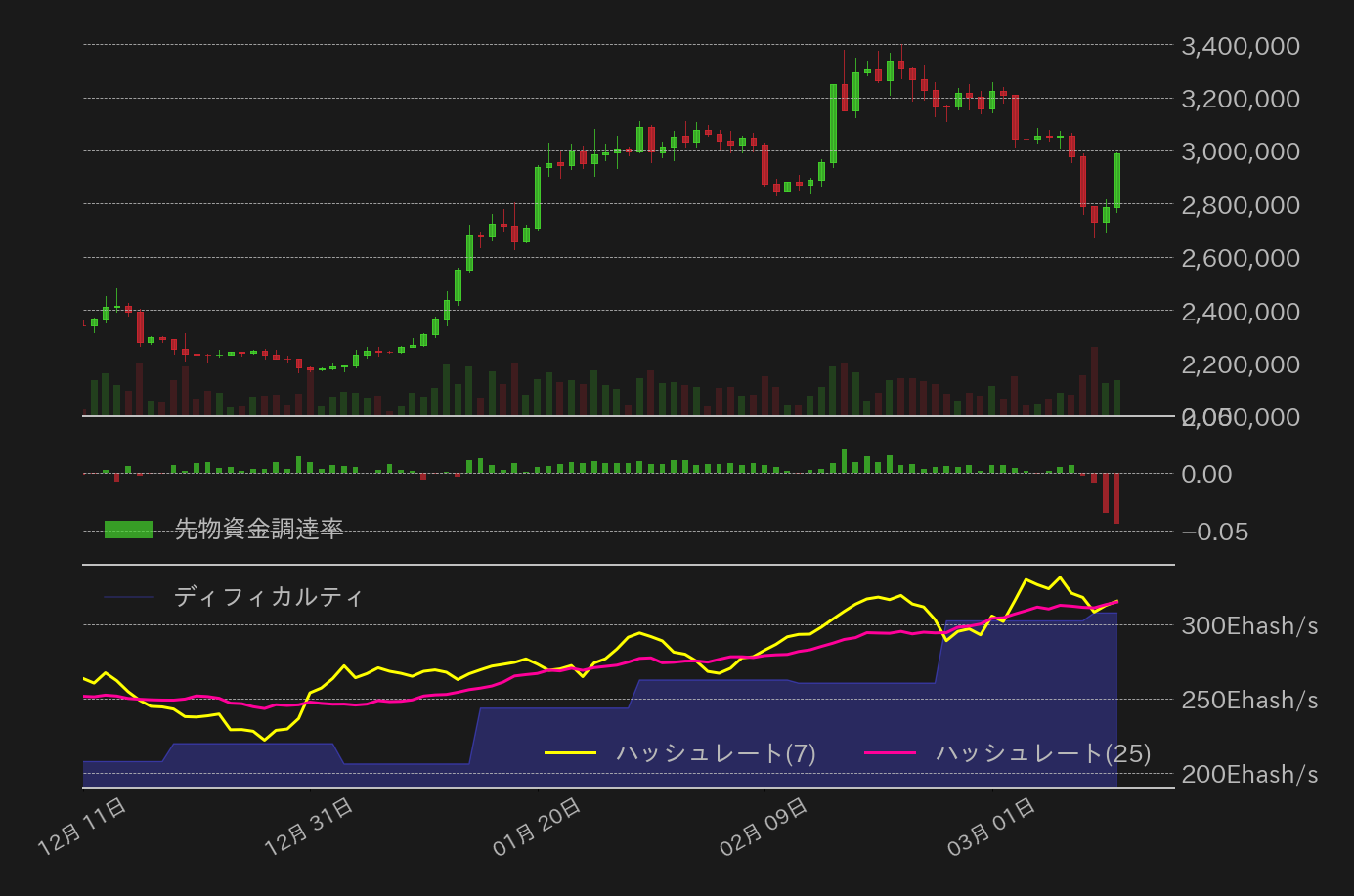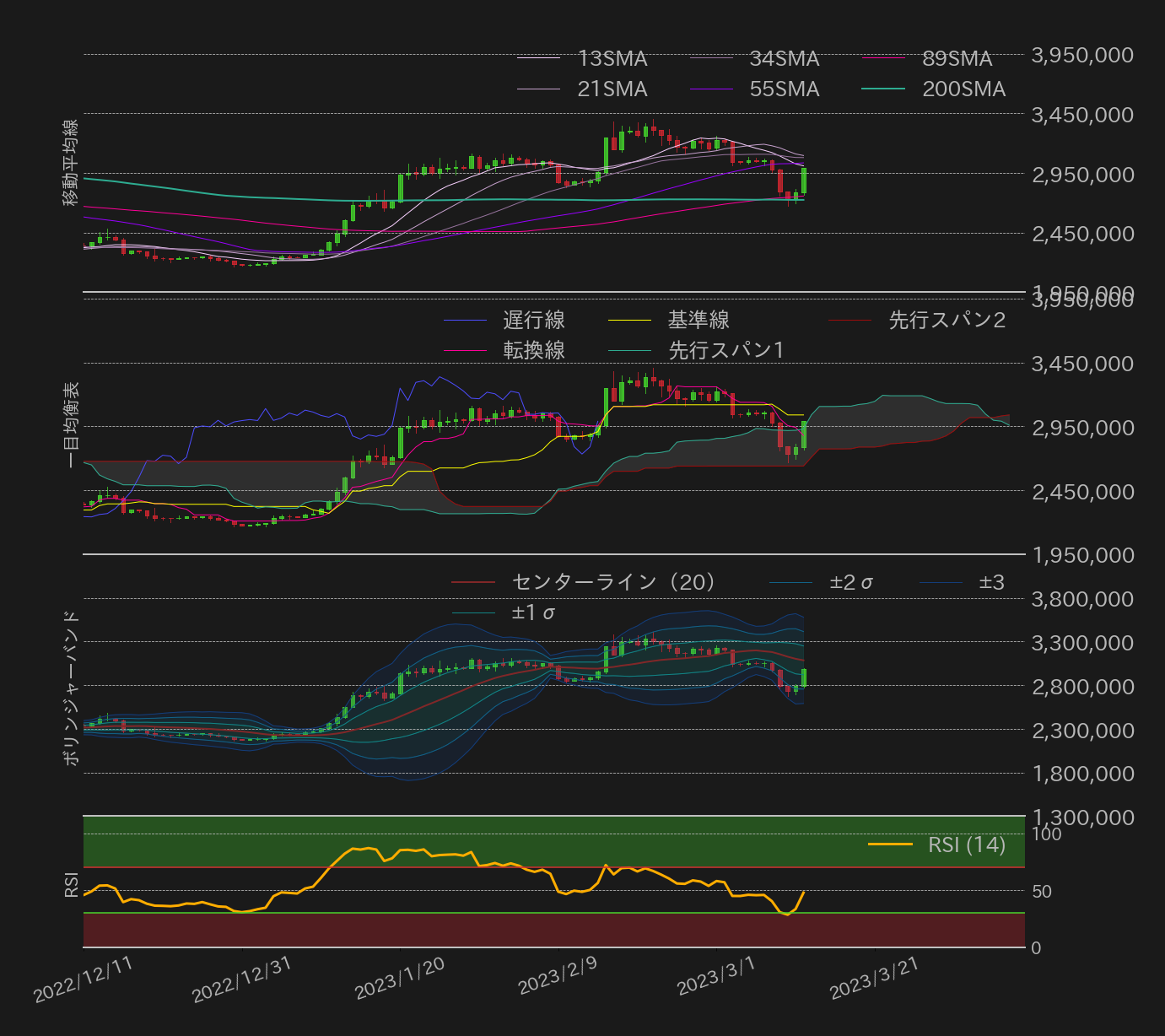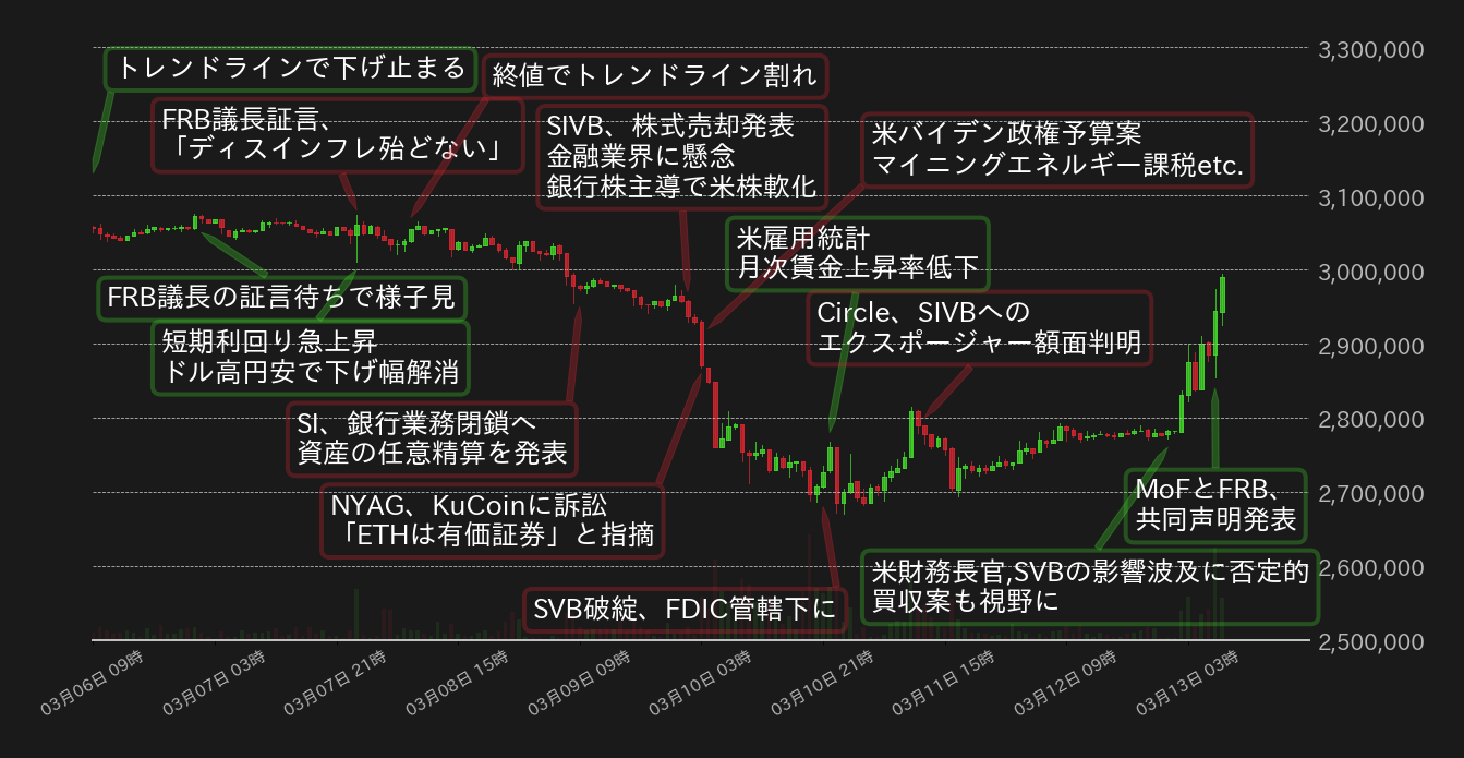 今朝方には、シグネチャーバンクもNY金融当局に業務停止を命じられたが、イエレン米財務長官がSVB破綻の影響波及に否定的な姿勢を示し、FDICによる同社の買収案を視野に入れていることを発表すると、BTC相場は急反発。さらに、米財務省(MoF)と米連邦準備制度理事会(FRB)が共同声明を発表し、SVBにある預金が完全に保護されることを発表し、シグネチャーバンクにも類似した特例を適用すると明かされると、相場は300万円にワンタッチした。