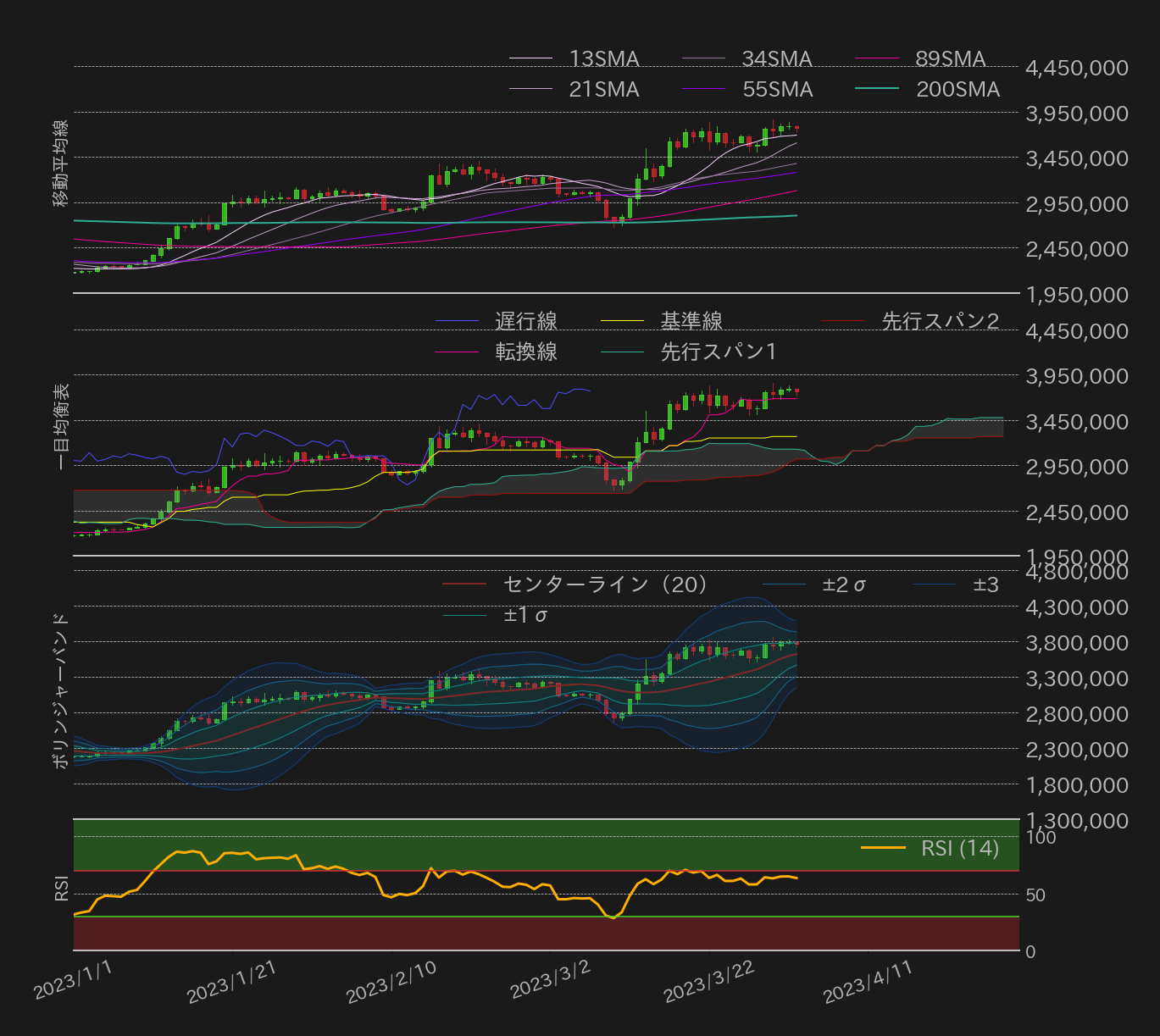 3月27日〜4月2日のビットコイン(BTC)対円相場の週足終値は、前週比95,743円(2.61%)高の3,768,360円と高値レンジ内で反発。ドル建てでは節目の28,000ドル(≒373.4万円)を維持した。