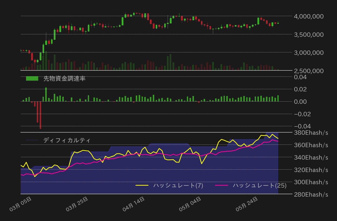 5月29日〜6月4日のビットコイン(BTC)対円相場の週足終値は、前週比141,212円(3.58%)安の3,807,998円と反落した。
