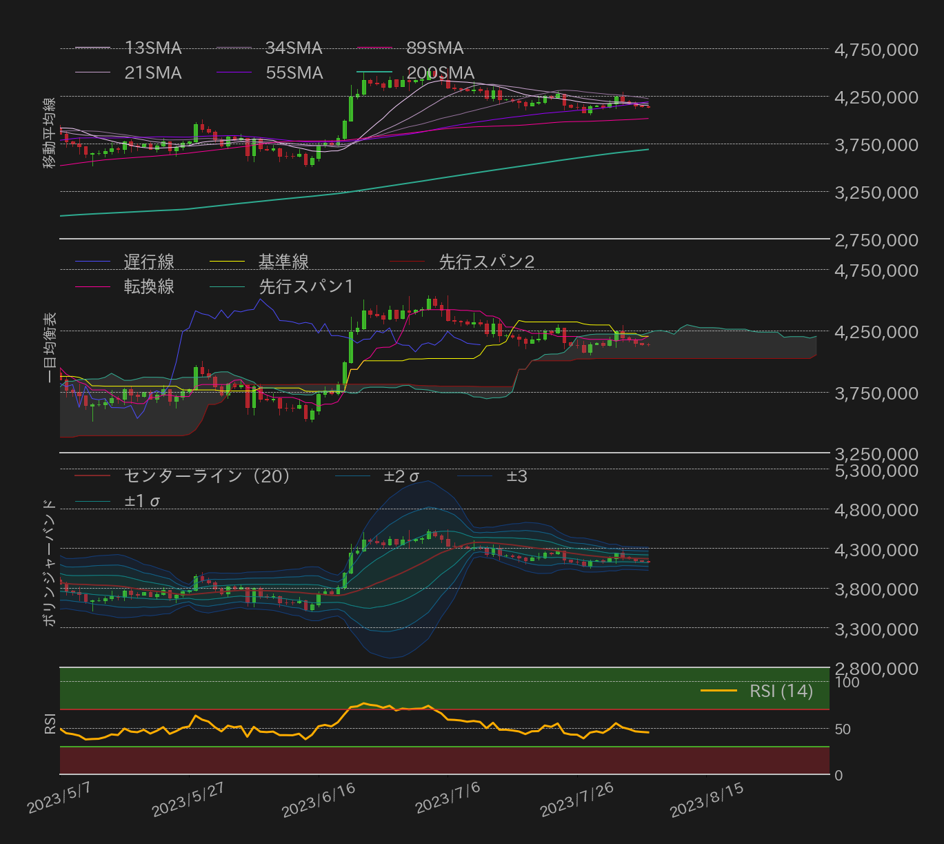 7月31日〜8月6日のビットコイン(BTC)対円相場の週足終値は、前週比4,074円(0.10%)高の4,133,888円とほぼ横ばい。足元では、29,000ドル水準となる約412万円周辺で揉み合いとなっている。