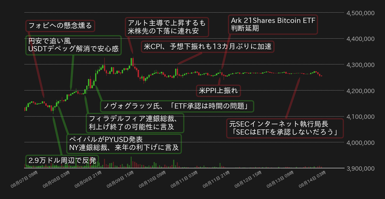 7月の米消費者物価指数(CPI)の発表を控え、警戒感から週央に430万円を割ったBTC相場だったが、結果が前年同月比で3.2%と市場予想の3.3%を下回った一方、6月の3.0%から13カ月ぶりに加速し、相場は上下に振れるも元の水準での揉み合いに戻った。翌日に発表された7月の米生産者物価指数(PPI)は、市場予想を上回るも誤差の範囲内となったことから、BTC相場への影響は限定された。