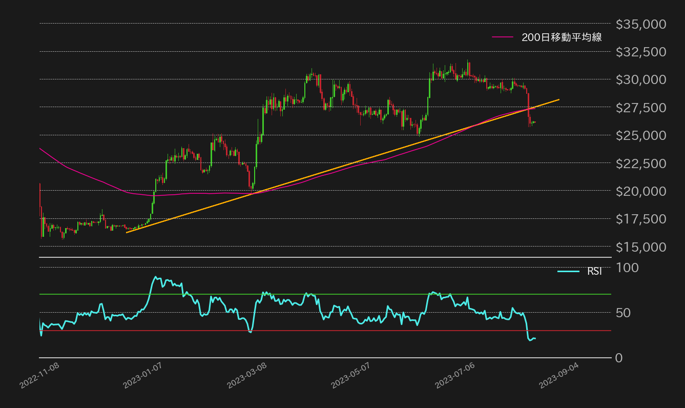 節目の26,000ドルはサポートとしてあまり頼りにならない印象があるが、2月高値の25,200ドル(≒366.3万円)周辺を目先の下値目途として見ている。