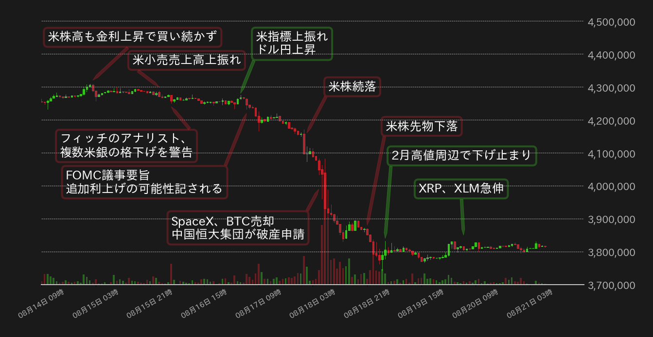 米連歩準備制度理事会(FRB)による年内追加利上げの可能性台頭や、中国恒大集団(エバーグランデ)の米国での破産法適用申請を受け、BTC円は16日に420万円台後半での揉み合いから下抜けを演じ、翌17日には400万円をも割り込んだ。