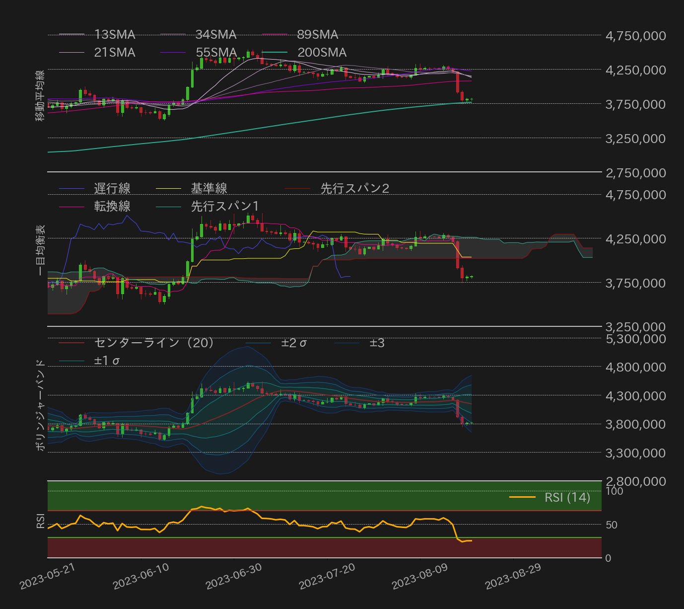14日〜20日のビットコイン(BTC)対円相場の週足終値は、前週比439,519円(10.33%)安の3,816,095円と大幅安を記録した。