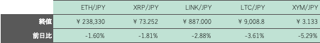 その後、相場は節目380万円台を維持すると、383万円周辺で揉み合いに転じ、週末も概ね落ち着いた展開となったが、FTXがソラナ(SOL)とFTトークン(FTT)の売却を巡り米裁判所から許可を待っているという報道を受けてSOLとFTT相場が急落。BTCはやや上値を重くすると、今朝方には不安定な値動きを演じ、380万円割れを窺う展開で終値を付けた。