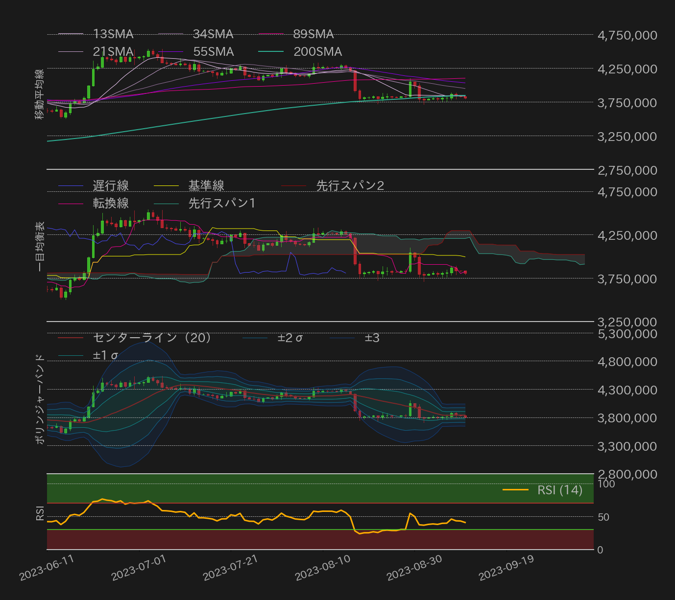 4日〜10日のビットコイン(BTC)対円相場の週足終値は、前週比2,950円(0.08%)高の3,807,799円とほぼ変わらずとなった。