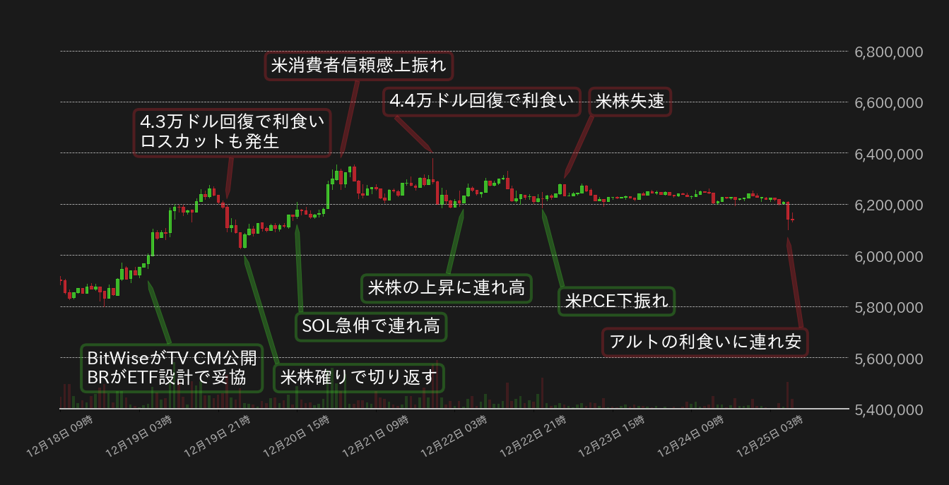 先週のBTC相場は、米国での現物型ビットコイン上場投資信託(ETF)早期承認期待やソラナ(SOL)を筆頭にアルトコイン相場が上昇したことで、640万円の上抜けを試したが、ドル建てで44,000ドル水準となる626万円を回復すると上値を重くしていた。22日には、11月の米個人消費支出(PCE)価格指数が下振れとなり、相場は一時小高く推移したが、クリスマス連休に伴う持ち高調整で米株が後半にかけて軟化し、BTCは上値トライに失敗した。