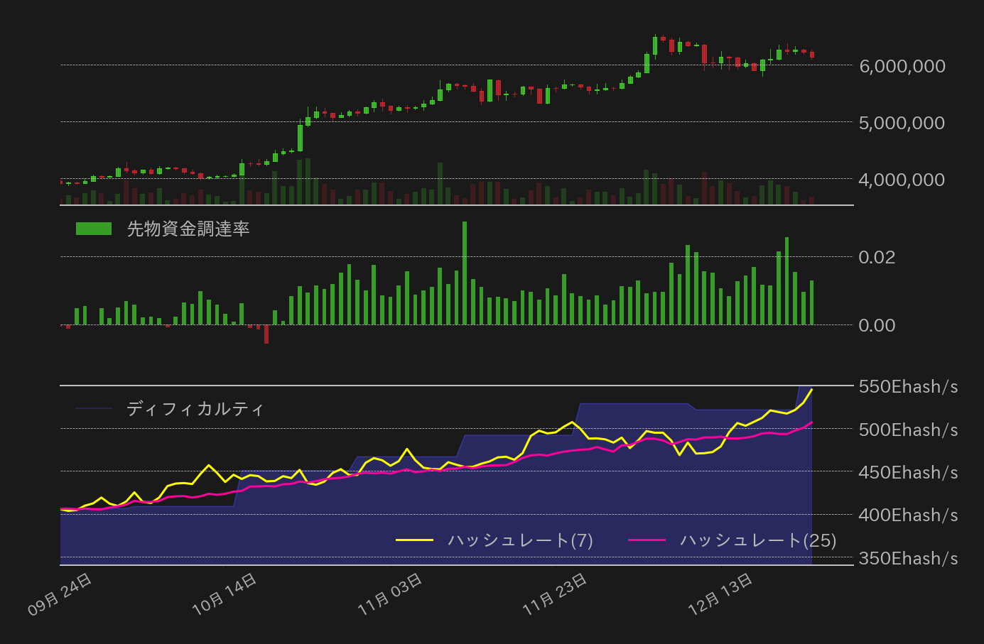 18日〜24日のビットコイン(BTC)対円相場の週足終値は、前週比232,273円(3.39%)高の6,138,069円と反発した。