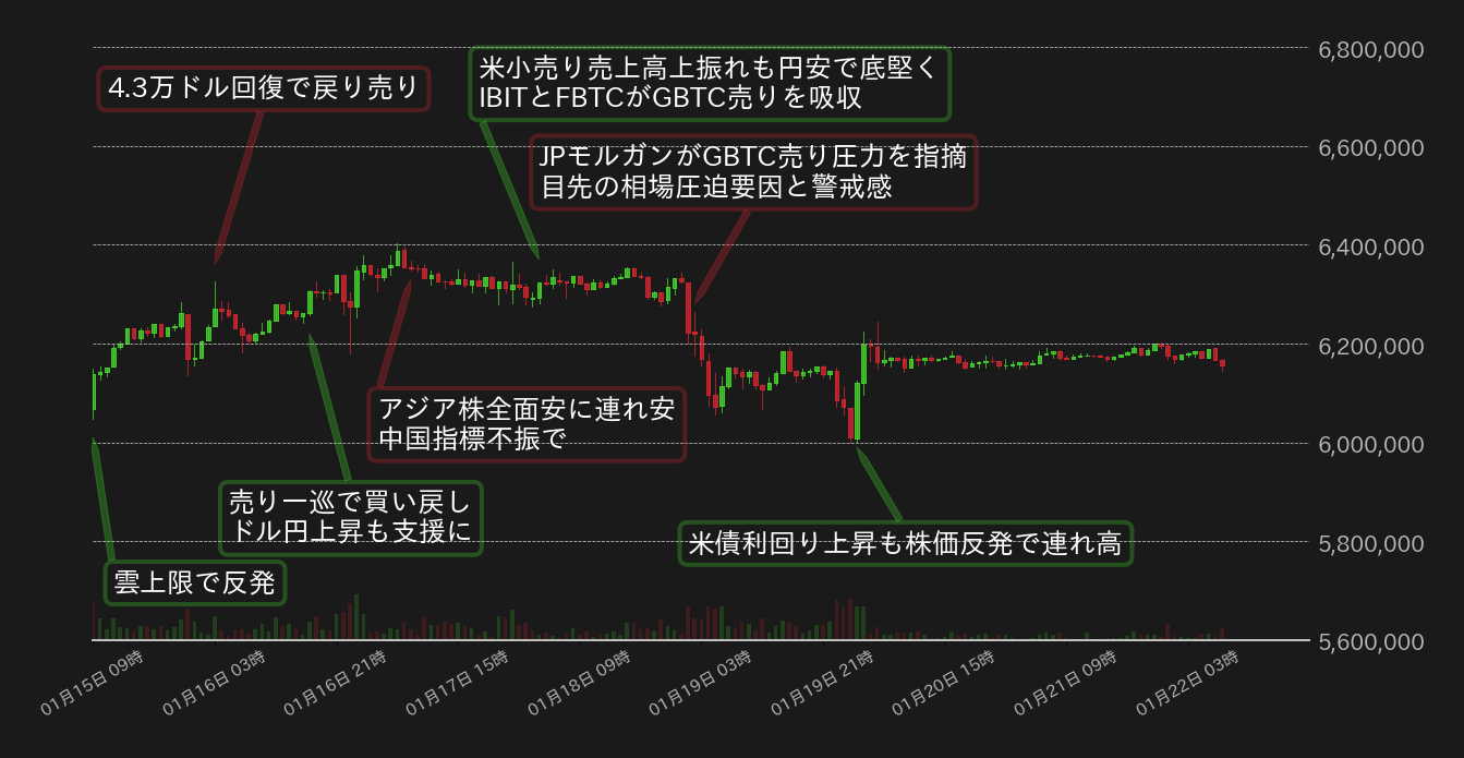 グレイスケールの現物ビットコイン上場投資信託(GBTC)からの資金流出による売り圧力が懸念され、先週のBTCは週後半に入ると632万円周辺から600万円近辺まで急落した。19日の米時間序盤には、強い米経済指標を受けた米債利回りの上昇が相場の重石となり、相場は一時600万円を割り込む場面もあったが、人工知能(AI)に関連する半導体や大型ハイテク株の上昇や、決算絡みの買いで米主要3株価指数が上昇すると、BTCも連れ高で下げ幅を奪回した。