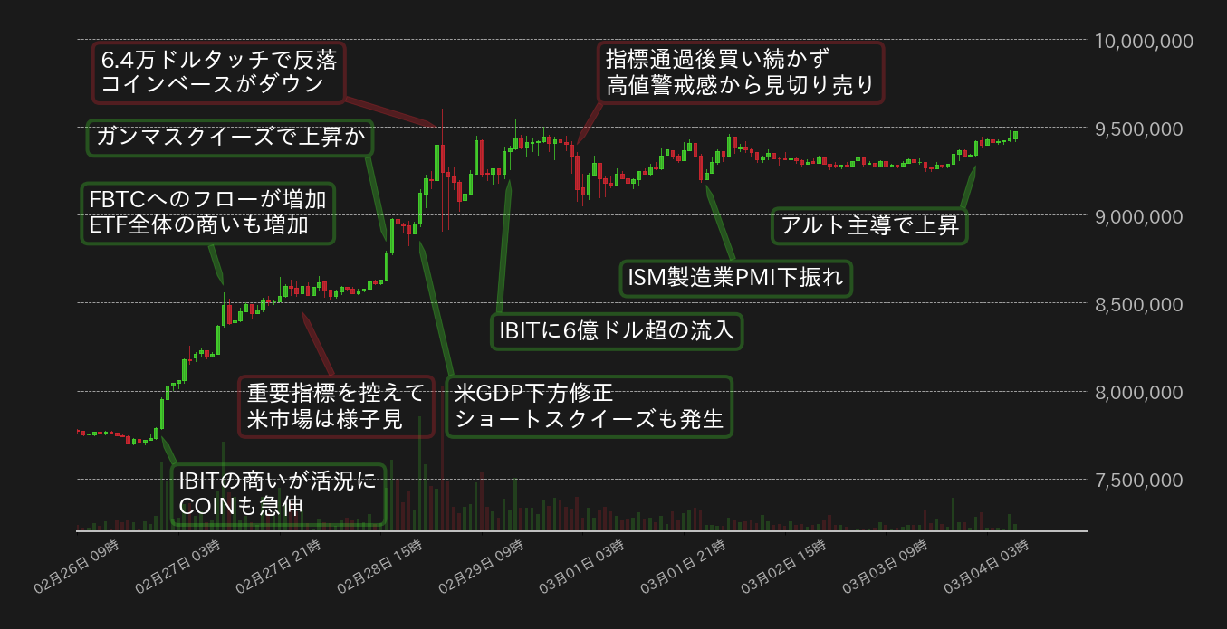 ただ、テクニカル的な過熱感からも一旦は調整が視野に入ったが、3月1日に全米供給管理協会(ISM)が発表した2月の製造業購買担当者景気指数(PMI)が市場予想比で下振れると、BTC相場の下値は支えられた。
