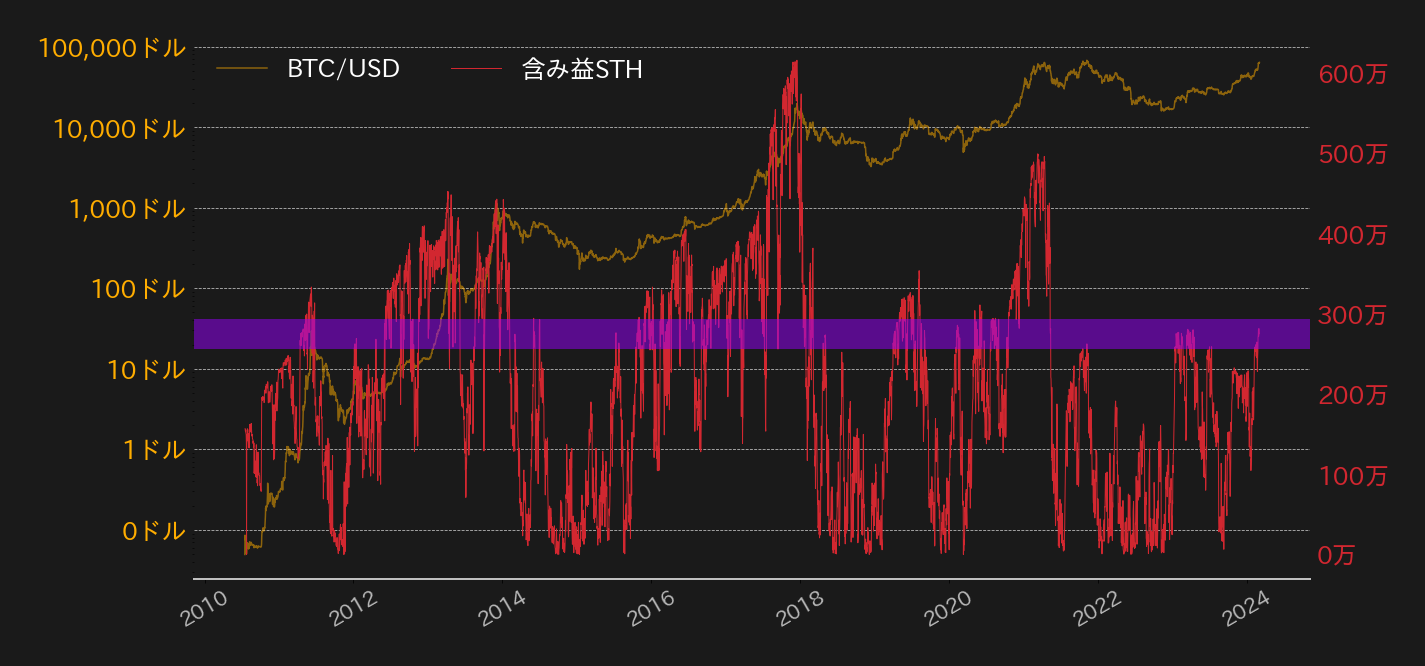 翻って、ビットコインのブロックチェーン上では、BTCの保有期間が半年未満の短期筋(Short Term Holder:STH)のアドレスの中で、含み益を抱えるアドレス数が300万に近づいている。含み益のSTH数が250万を超えてくると(第2図内紫帯)、大体の場合は利益確定の売りで相場が調整となりやすいが、例外として半減期後の相場上昇局面ではこの数値が300万を大きく超えてきている。つまり、現状では次の半減期まであと1カ月ほどあるが、足元のBTC相場は本格的なブルマーケット突入か調整かの瀬戸際にあると言える。