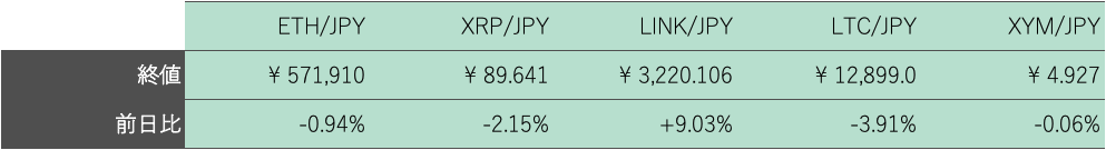 4日〜10日のビットコイン(BTC)対円相場の週足終値は、前週比692,789円(7.31%)高の10,169,332円と2週続伸した。