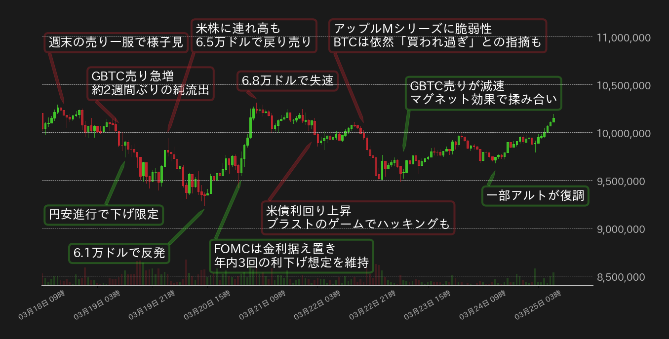 米国の現物ビットコインETFへの資金フローが純流出に転じたことで、先週前半のBTC円は1030万円から下値を模索する展開を繰り広げ、一時は923万円まで下落した。一方、ドル建てで61,000ドルとなる同水準で相場は下げ止まると、米公開市場委員会(FOMC)の経済見通しで年内3回の利下げ想定が維持されたことで急反発を演じ、20日には週初の下げ幅を奪回した。