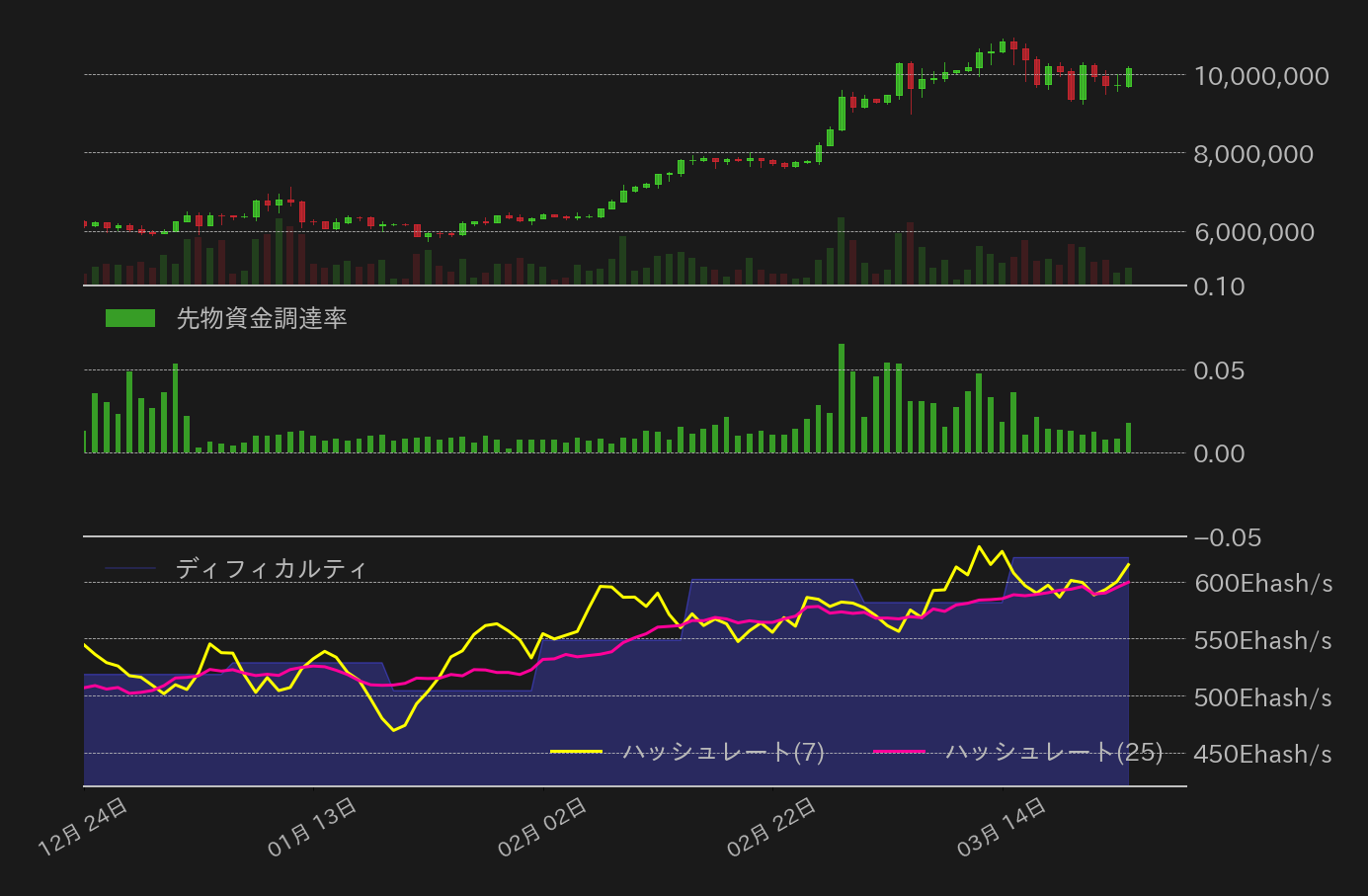 ただ、今回のFOMCはタカ派に傾斜すると市場で予想されていたため、昨年末からの金利見通しの維持はハト派に映った訳だが、利下げ開始のタイミングについては手掛かりを掴めず、21日のBTCは68,000ドル水準となる1027万円周辺で失速。すると、米新規失業保険申請件数の下振れや景気先行指数の上振れを受けて米債利回りが上昇し、BTC円の上値は圧迫された。さらに、22日にはアップルのMシリーズチップで秘密鍵が流出する可能性がある脆弱性が発見された他、JPモルガンが「ビットコインは依然として買われ過ぎ」と指摘したことで、相場は1000万円の維持に失敗し、950万円近辺まで下落した。