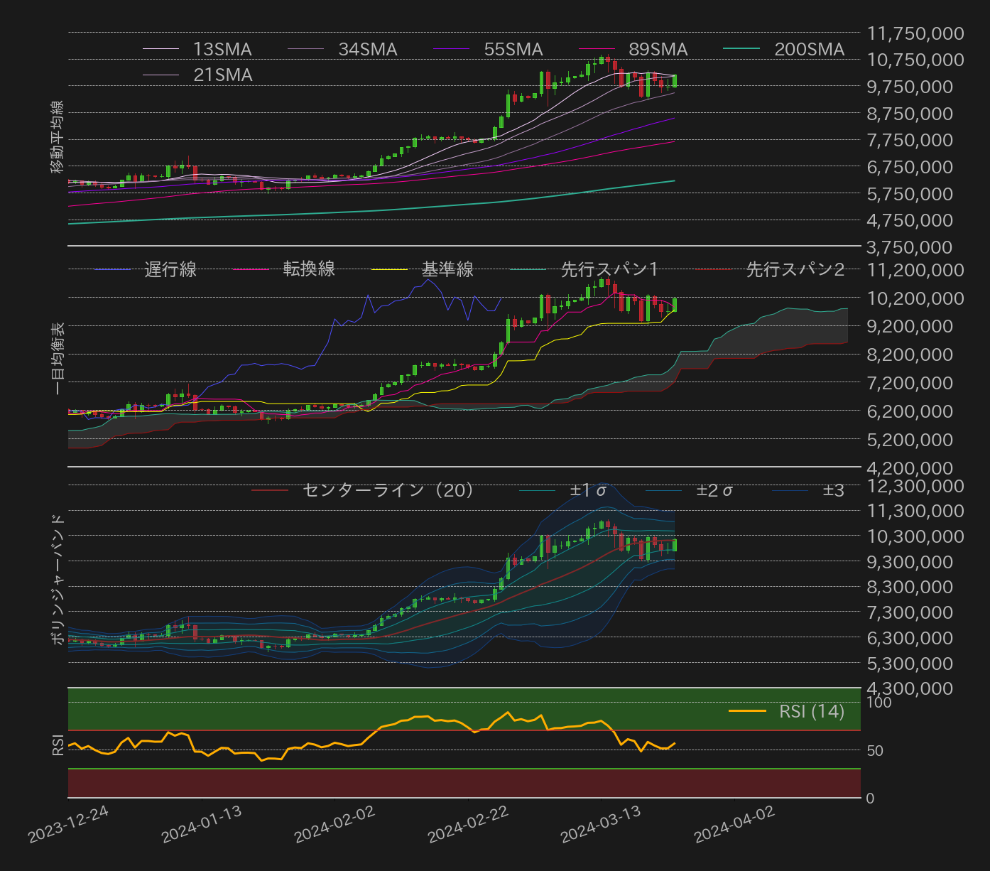 ただ、ドル建てのBTC相場は67,000ドルを回復して先週の取引を終えており、窓埋め後は再びオプション市場のマグネット効果で底堅い推移となろう。また、65,000ドル周辺には一目均衡表の転換線やボリンジャーバンドの-1σといったテクニカル的なサポートも位置しており、60,000ドル台中盤は相場の強いサポートになると見ている。