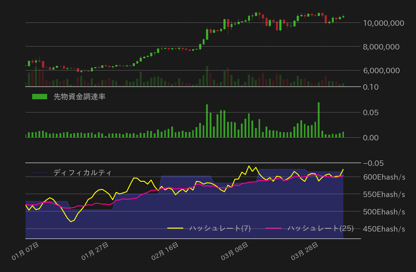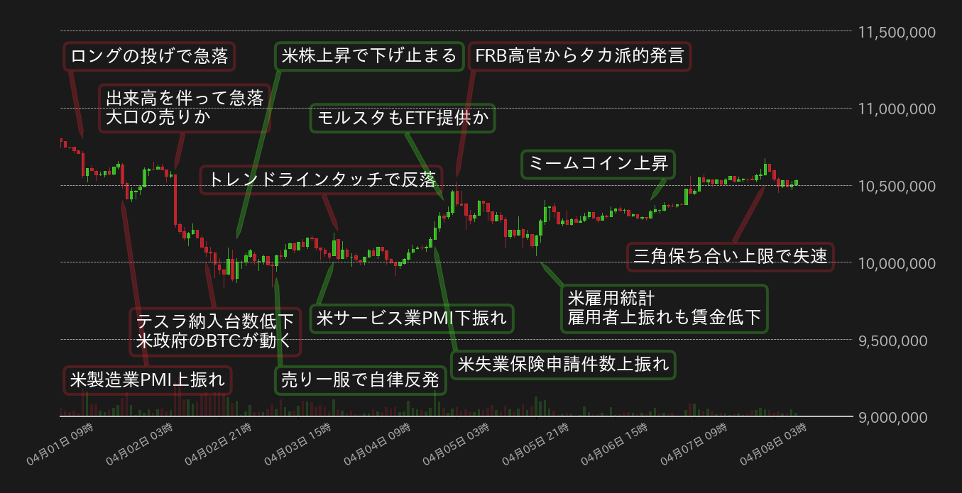 4月1日〜4月6日のビットコイン(BTC)対円相場の週足終値は、前週比270,238円(2.50%)安の10,529,761円と反落したが、終値は安値の983.5万円から7%ほど上昇し、底堅さも印象付ける値動きとなった。