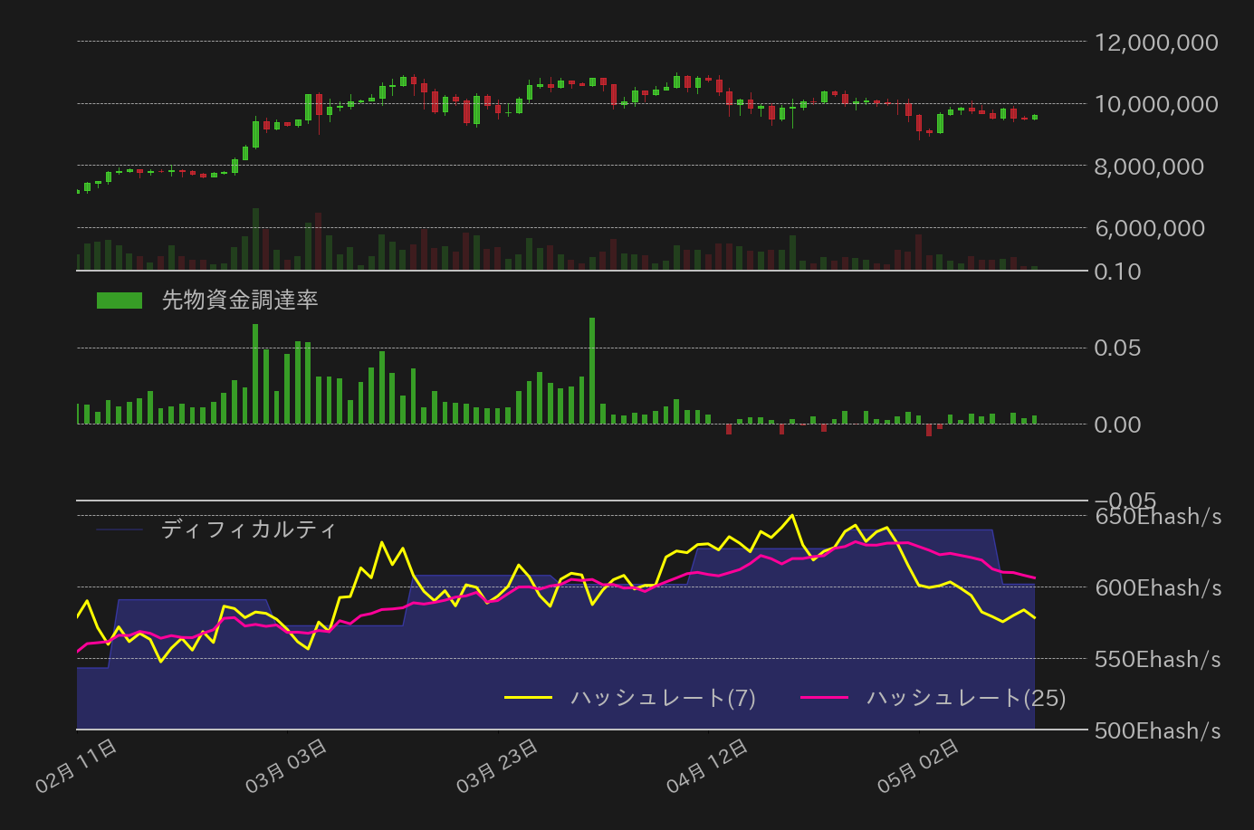 第4図:BTC対円、先物資金調達率、ハッシュレートとディフィカルティチャート 日次 出所:bitbank.cc、Glassnodeより作成