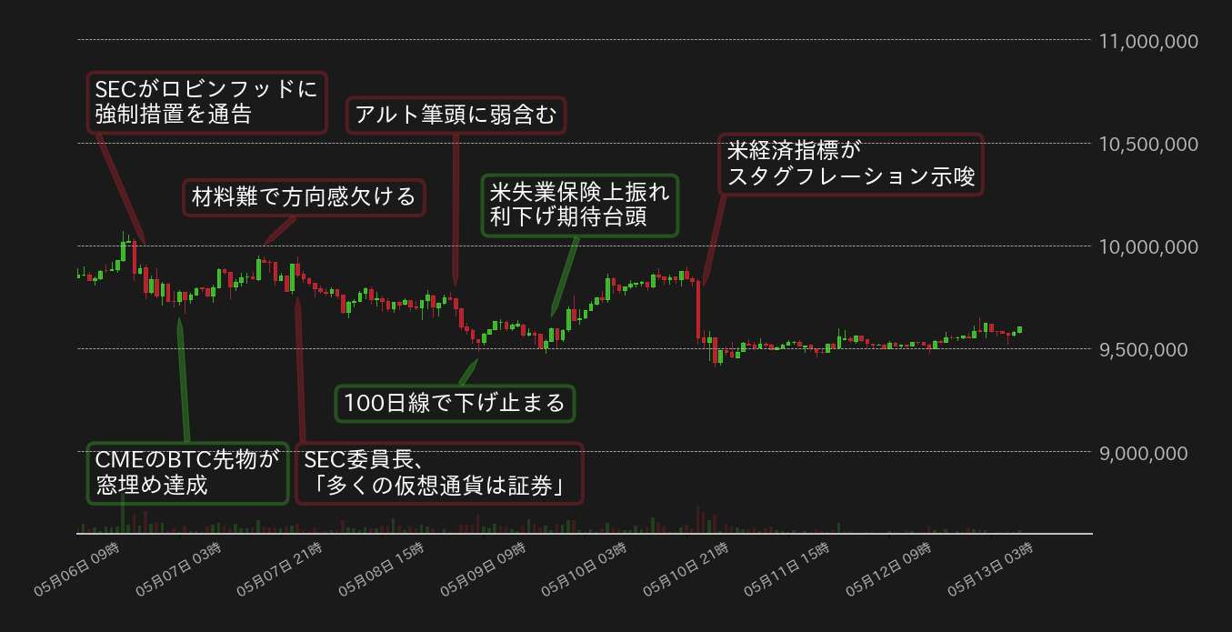 先週は買い材料に乏しい中、米証券取引委員会(SEC)によるロビンフッドに対する強制措置の通告などを受けて、BTCは1000万円周辺から小緩む展開で始まり、週央には950万円下抜けを試した。しかし、BTCはドル建てで100日移動平均線が走る61,000ドル周辺(≒950.2万円)で下げ止まると、9日に発表された米新規失業保険申請件数の上振れを受けて反発し、一時は980万円台に戻した。