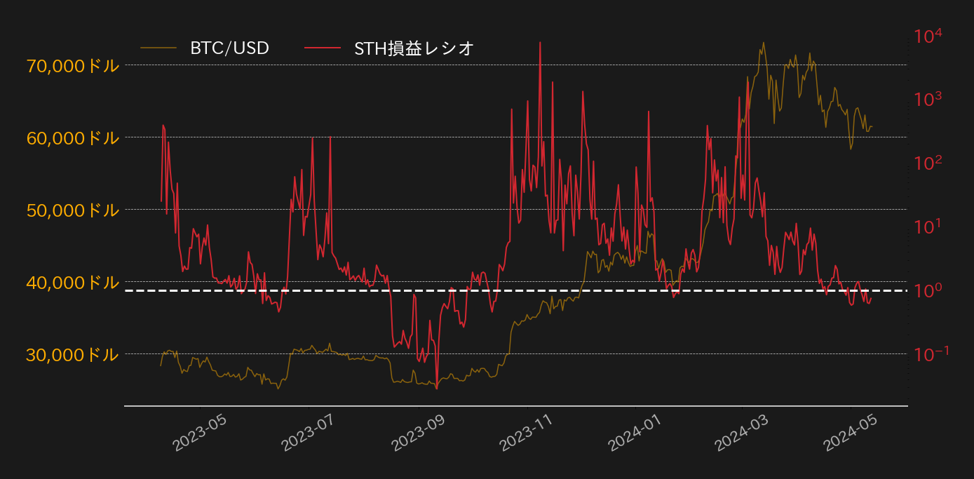 第3図:短期保有BTCの損益レシオ 日次 出所:Glassnodeより作成