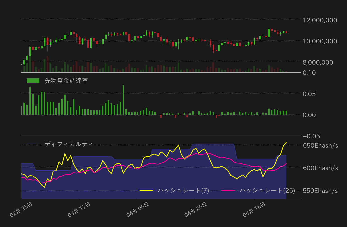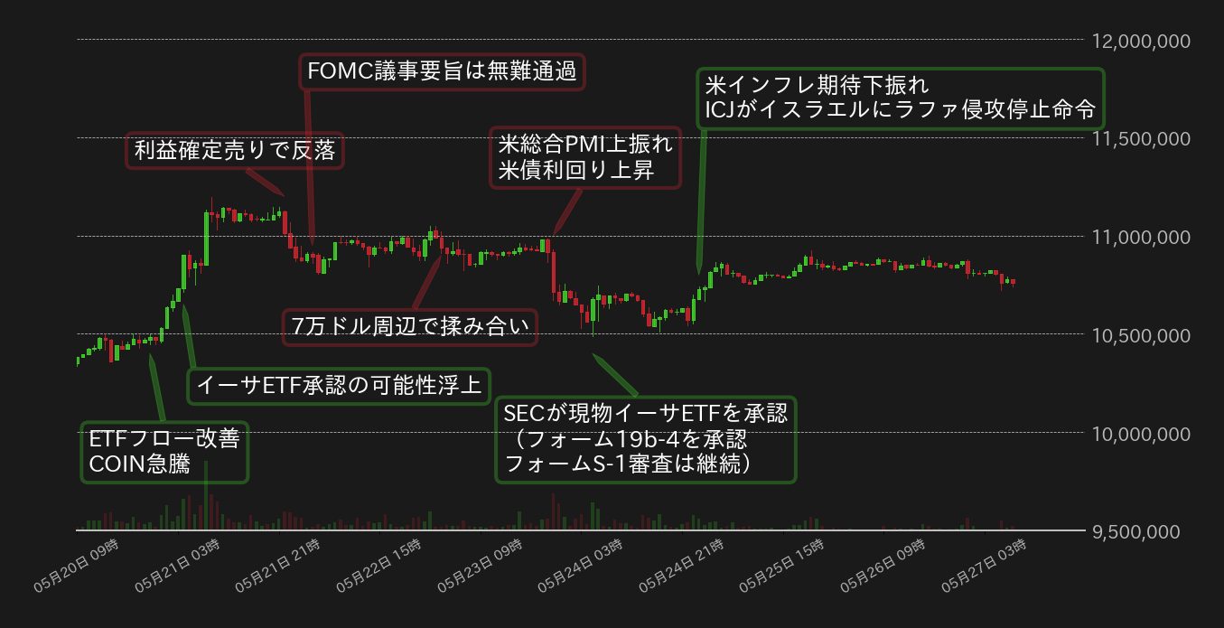 先週のBTC円は週明けの相場上昇で史上最高値の1100万円を更新するも、その後は失速し、23日には1050万円周辺まで押した。しかし、24日朝方に米証券取引委員会(SEC)が現物イーサETFを上場させるためのルール変更申請を承認し(証券登録申請は依然審査中)、イーサ(ETH)相場の上昇につれてBTC円も下げ止まると、この日の米国時間に米ミシガン大学が発表した消費者信頼感指数の低下と期待インフレの下振れを好感し、相場は下げ幅を縮小した。また、同日には国際司法裁(ICJ)がイスラエルに対してガザ地区南部ラファの侵攻停止命令を下し、中東情勢悪化の収束期待が相場の支えとなった。
