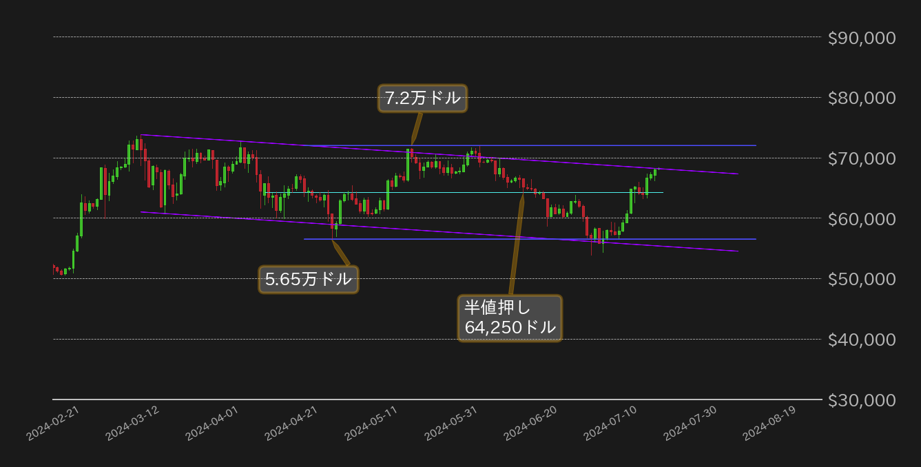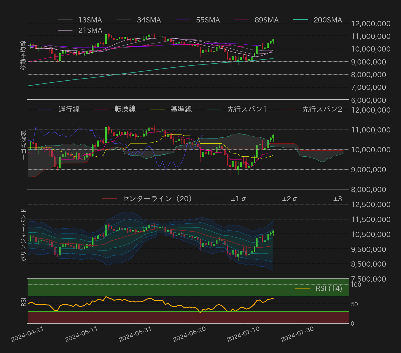 週末の相場は概ね1050万円周辺での取引が続いたが、バイデン米大統領が選挙戦撤退を表明するとBTCは上下に振れた。しかし、同氏が大統領候補としてカマラ・ハリス副大統領を支持すると、BTCは1070万円台中盤まで上昇した。
