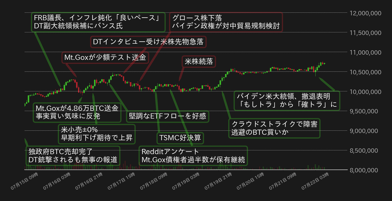 ドイツ政府のBTC売却完了に加え、暗殺未遂事件で勢いづいたトランプ前米大統領の選挙キャンペーンにより、先週のBTC円は週明けから1000万円を回復するも、米株式市場のトランプトレードへのシフト(半導体や大型ITなどのグロース株からエネルギーや金融などのバリュー株への資金シフト)によって、週央からは1050万円周辺で上値を抑えられた。