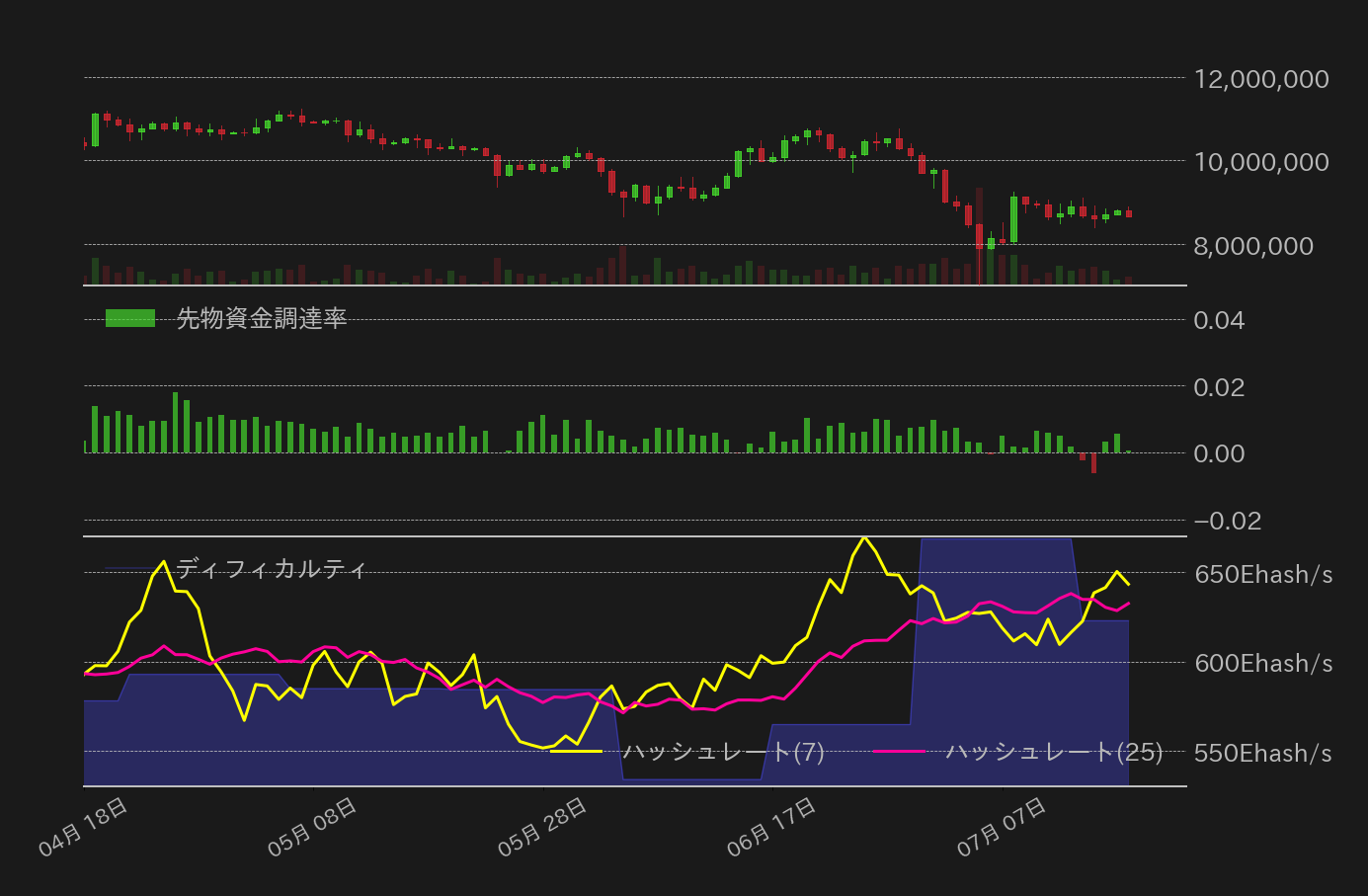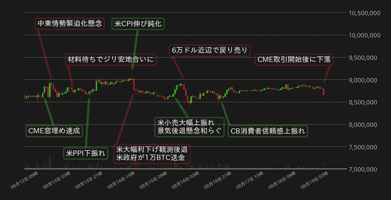 米国の経済指標がインフレの継続的な伸び鈍化を示し、消費関連のデータが強めにでたことで、先週のBTC円は下値を支えられた一方、中東情勢の緊迫化や、米政府によるBTC売りの思惑などが相場の重石となり、1週間を通して概ね800万円台後半での揉み合いに終始した。