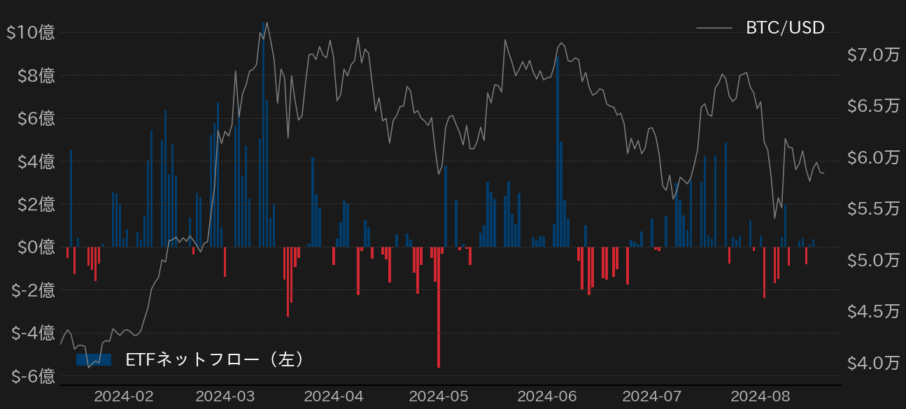 実際、シカゴマーカンタイル取引所(CME)のBTC先物の建玉は、2週間前に急落してから回復していない他、7月は堅調だった米国の現物ビットコインETFへの資金フローも足元ではまちまちとなっている(第2図)。