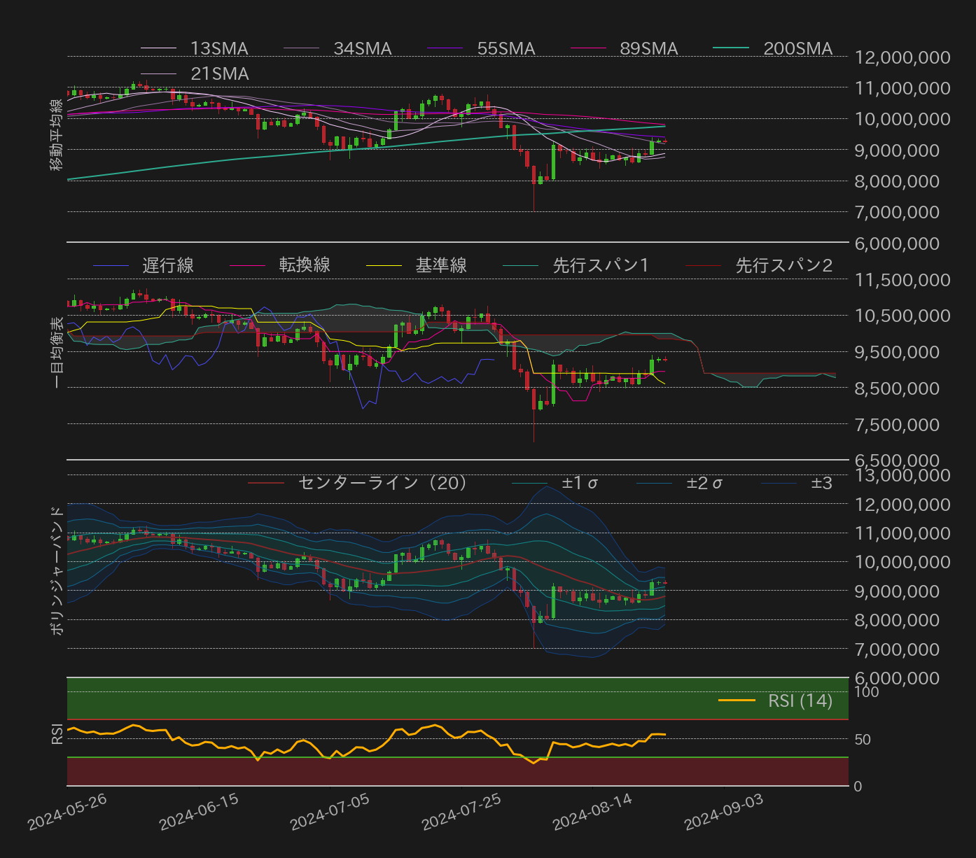 一方、パウエルFRB議長はジャクソンホールでの講演で、「金融政策を調整する時が来た」と9月の利下げ着手に向けた明確なシグナルを発したことで、BTC円は900万円台の回復に成功した。その後、相場は65,000ドル水準(≒935.2万円)で失速すると、週末は概ね925万円周辺での揉み合いに終始した。