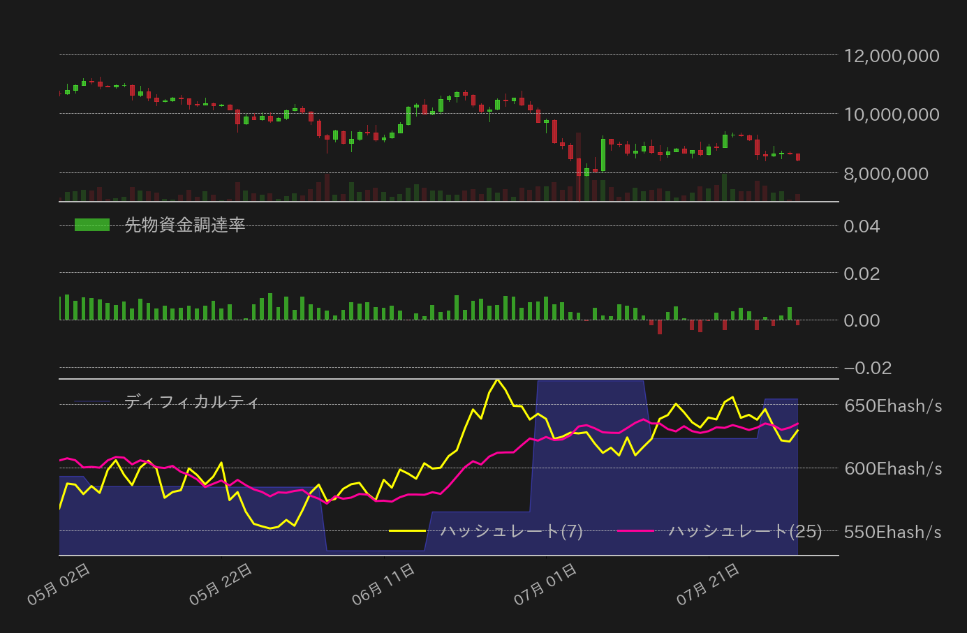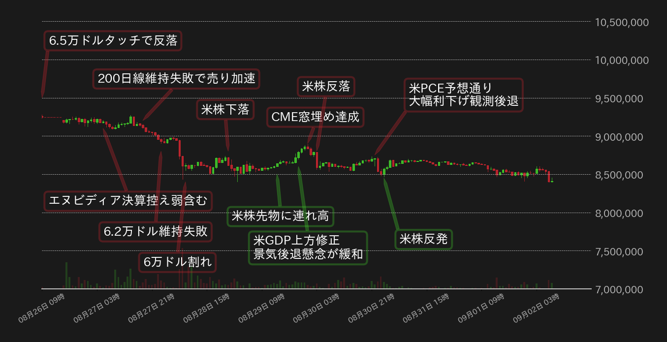 先週は特段に目立った売り材料も視界に入ってこなかったが、ジャクソンホール通過後に相場が900万円台に回復した時点で先物市場では過熱感もあり、相場が200日線などテクニカル的なサポートを次々と割り込む中、ロングの投げが発生した格好だ。