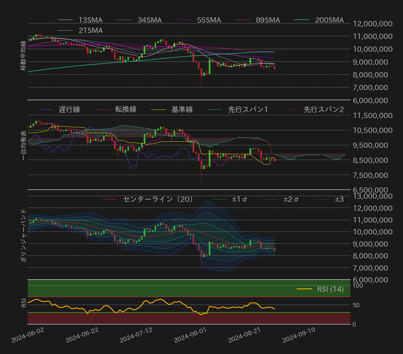 8月26日〜9月1日のビットコイン(BTC)対円相場の週足終値は、前週比848,842円(9.17%)安の8,409,678円と反落した。一方、8月のBTC円は一時-27.88%と大きく下げたが、月足終値は-11.05%の8,632,879円に止まり、長い下ヒゲを付けた。