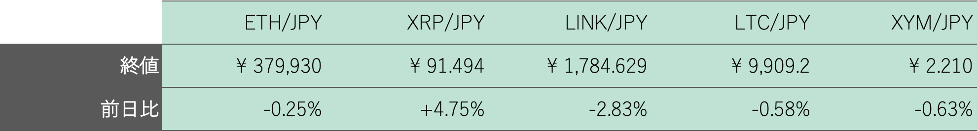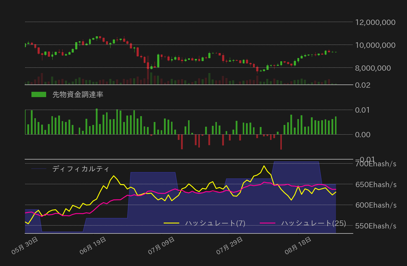 23日〜29日のビットコイン(BTC)対円相場の週足終値は、前週比227,122円(2.48%)高の9,379,033円と3週続伸し、およそ2カ月ぶりの高値に戻した。