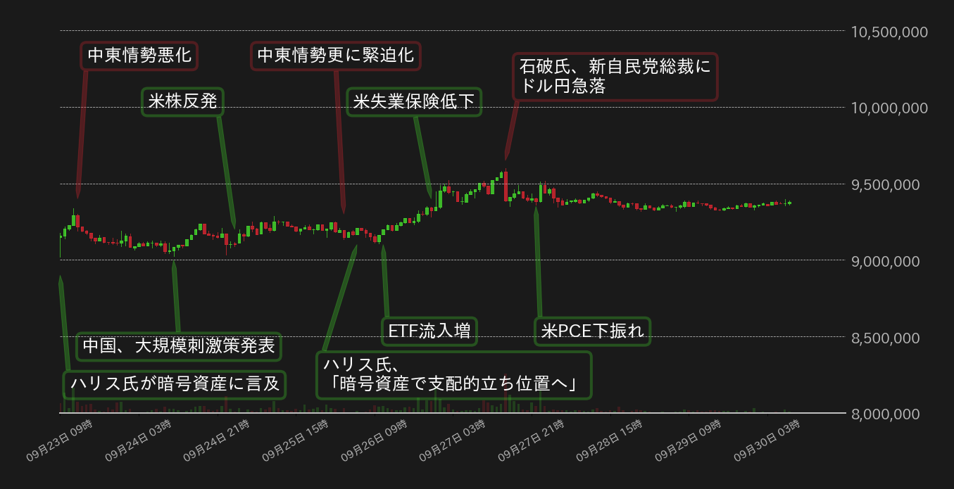 先週の相場は915万円から取引を開始した。週明けにはハリス氏が初めて暗号資産(仮想通貨)に対してポジティブな発言をしたことで、相場は一時930万円台に乗せるも、中東情勢の緊迫化で上値を抑えられた。週前半はその後も底堅い値動きが続いたが、900万円台前半で方向感に欠ける展開に終始した。