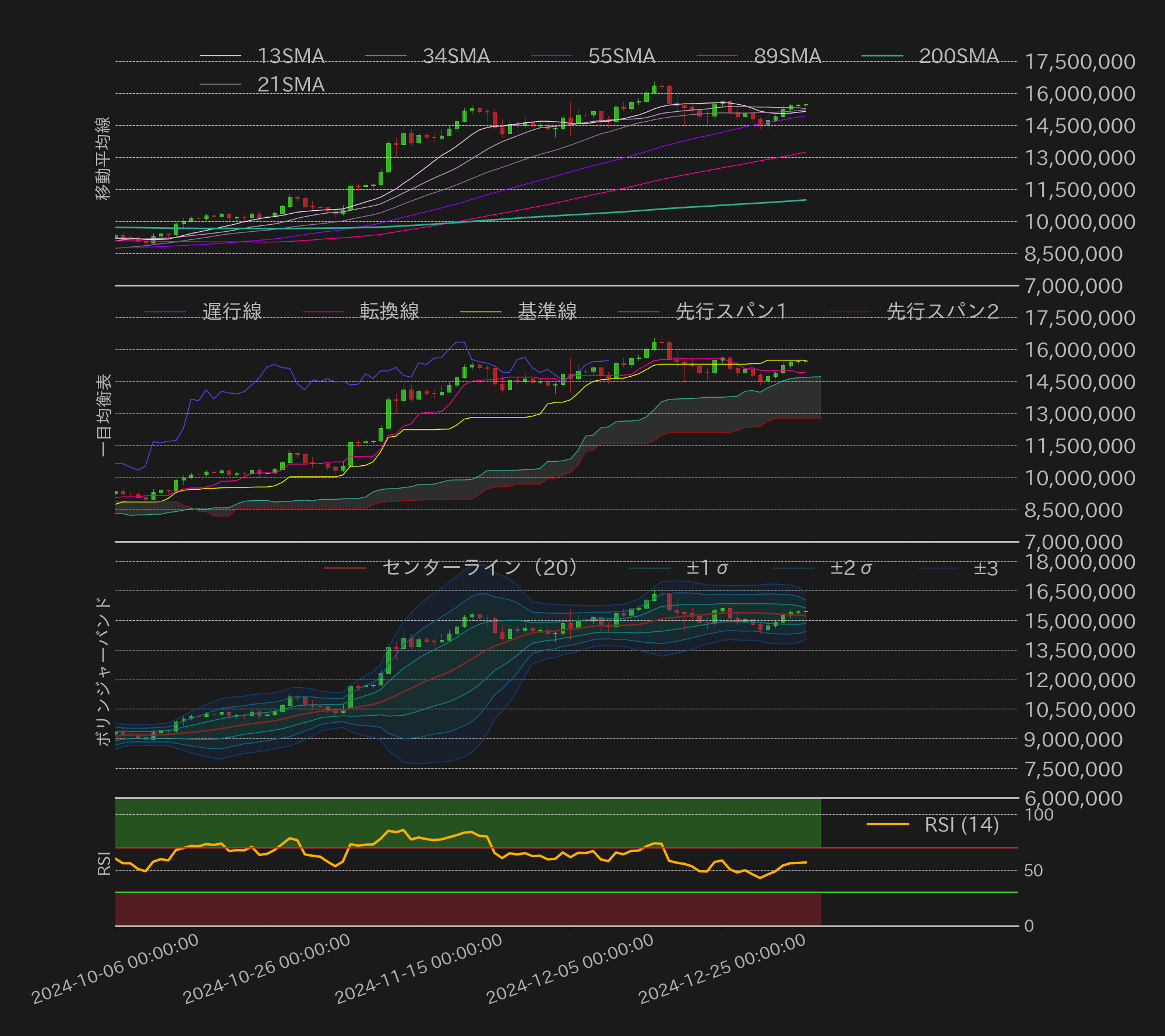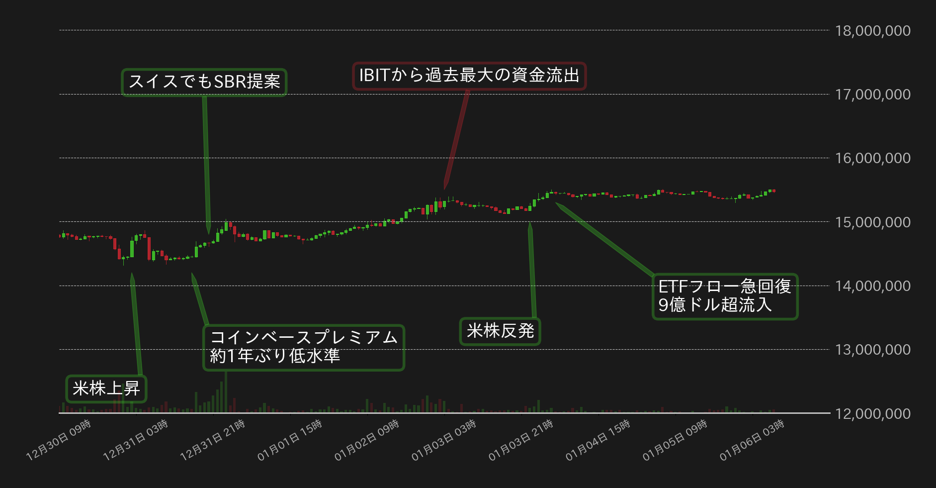 1480万円周辺から取引が始まった先週のBTC円は、週明け30日の海外時間に一段安を演じ、1430万円周辺まで水準を下げた。しかし31日には、クリプトクワントがコインベースプレミアムが2024年1月ぶりの低水準に下落したと指摘したことで割安感から相場は切り返すと、スイス政府がスイス国立銀行にBTCを準備金として保有させる憲法改正案を連邦官報に登録したことも好感され、BTC円は強含みに推移。新年1月1日からも締まる地合いが続き、2日の米国時間には1540万円近辺まで水準を戻した。
