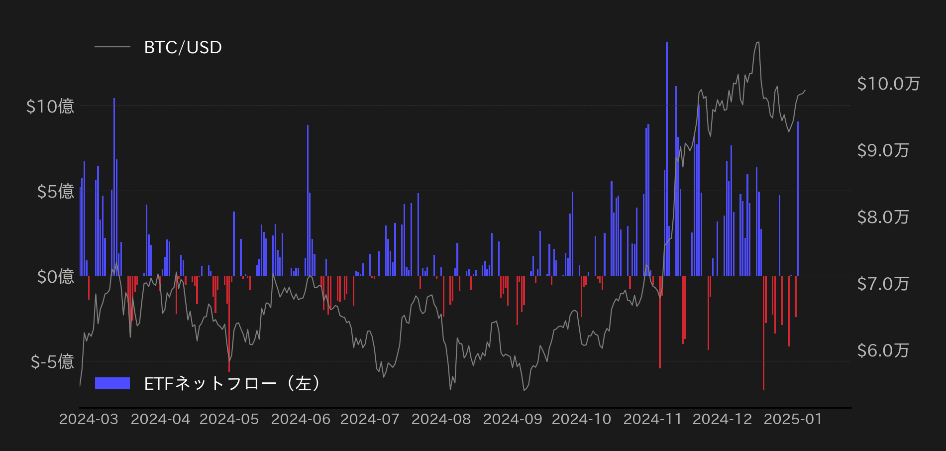 また、3日には米国の現物ビットコインETFに計9.08億ドルの資金流入があり、週末のBTCは底堅く推移。本日は既に9万9000ドル(≒1560万円)を試す展開となっている。