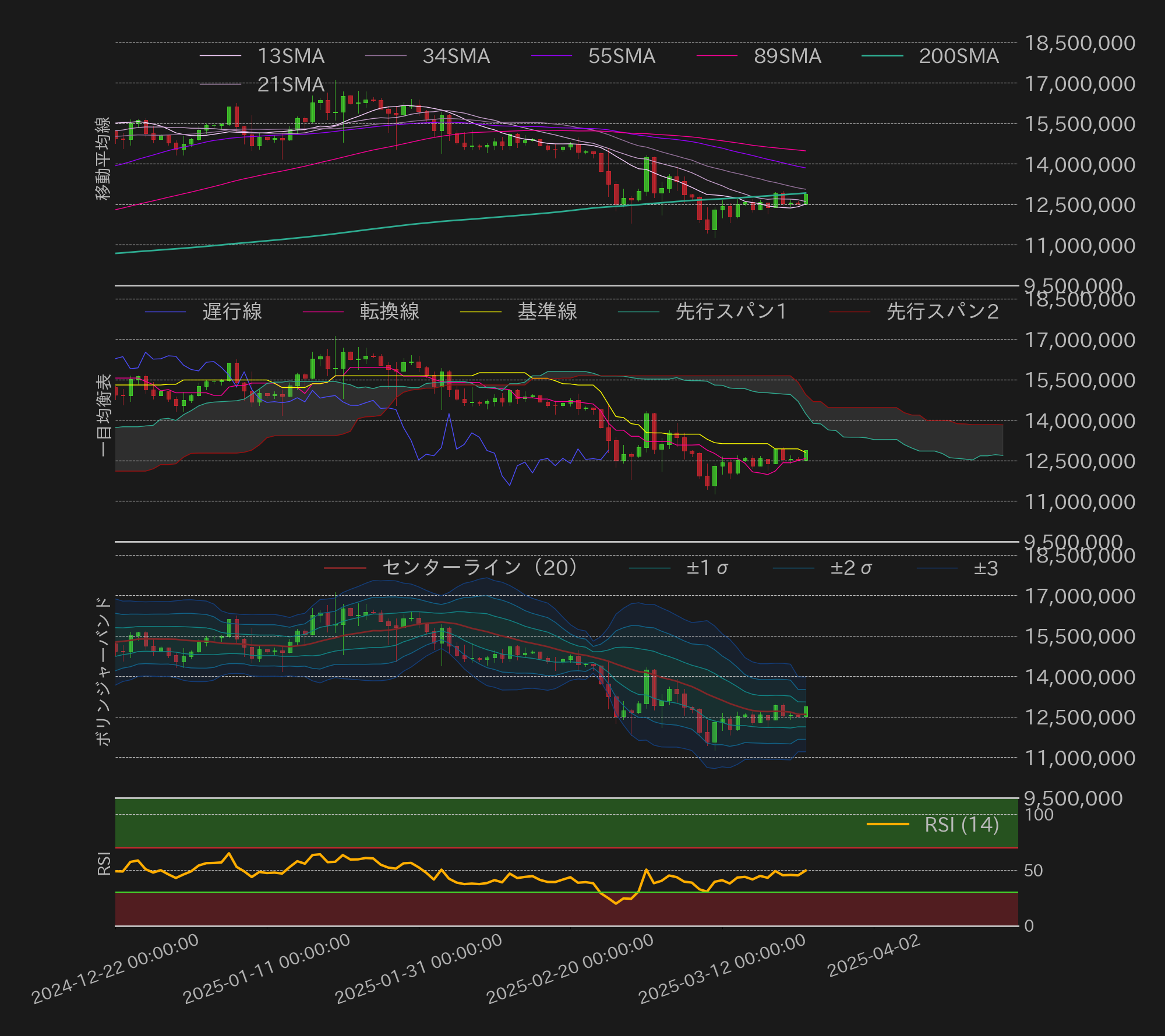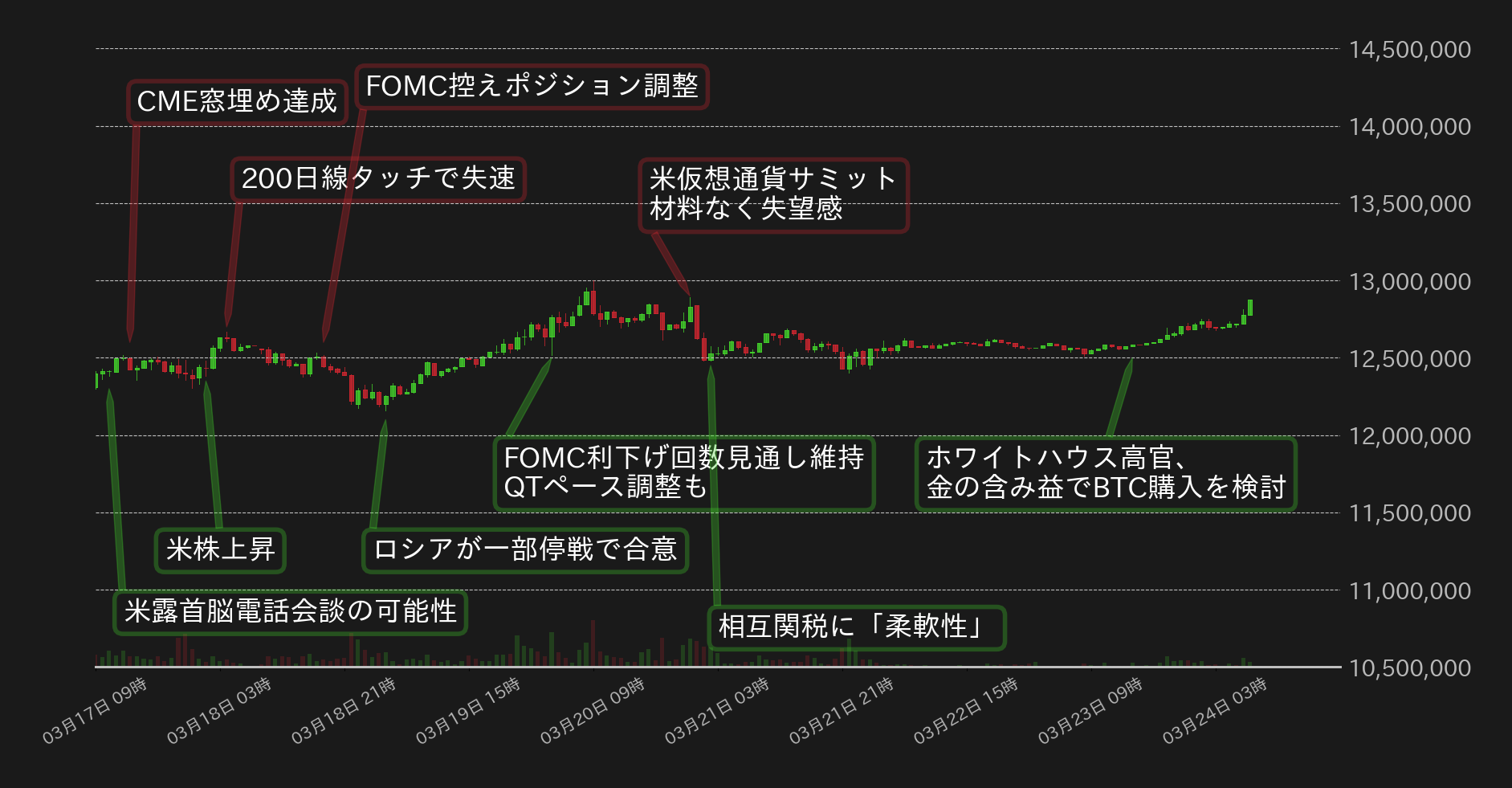 しかし、その後は再び上値を重くすると、21日米国時間に開催された米暗号資産(仮想通貨)サミットで目星い材料がでなかったことで、失望感から相場は1250万円周辺まで反落。幸い、この日はトランプ米大統領が、4月2日から発動される予定の相互関税において対象国に関して「柔軟性」を設けると発言したことで、その後は米株の上昇に支えられた。