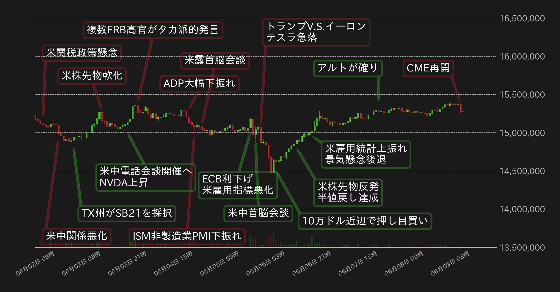 週央まで1500万円周辺で方向感に欠ける展開が続いた先週のBTC円だったが、「トランプ減税」法案を巡ってトランプ氏とマスク氏が批判の応酬を繰り広げたことで、5日の米株市場ではテスラが急落し、BTCも連れて一時1450万円周辺まで水準を下げた。