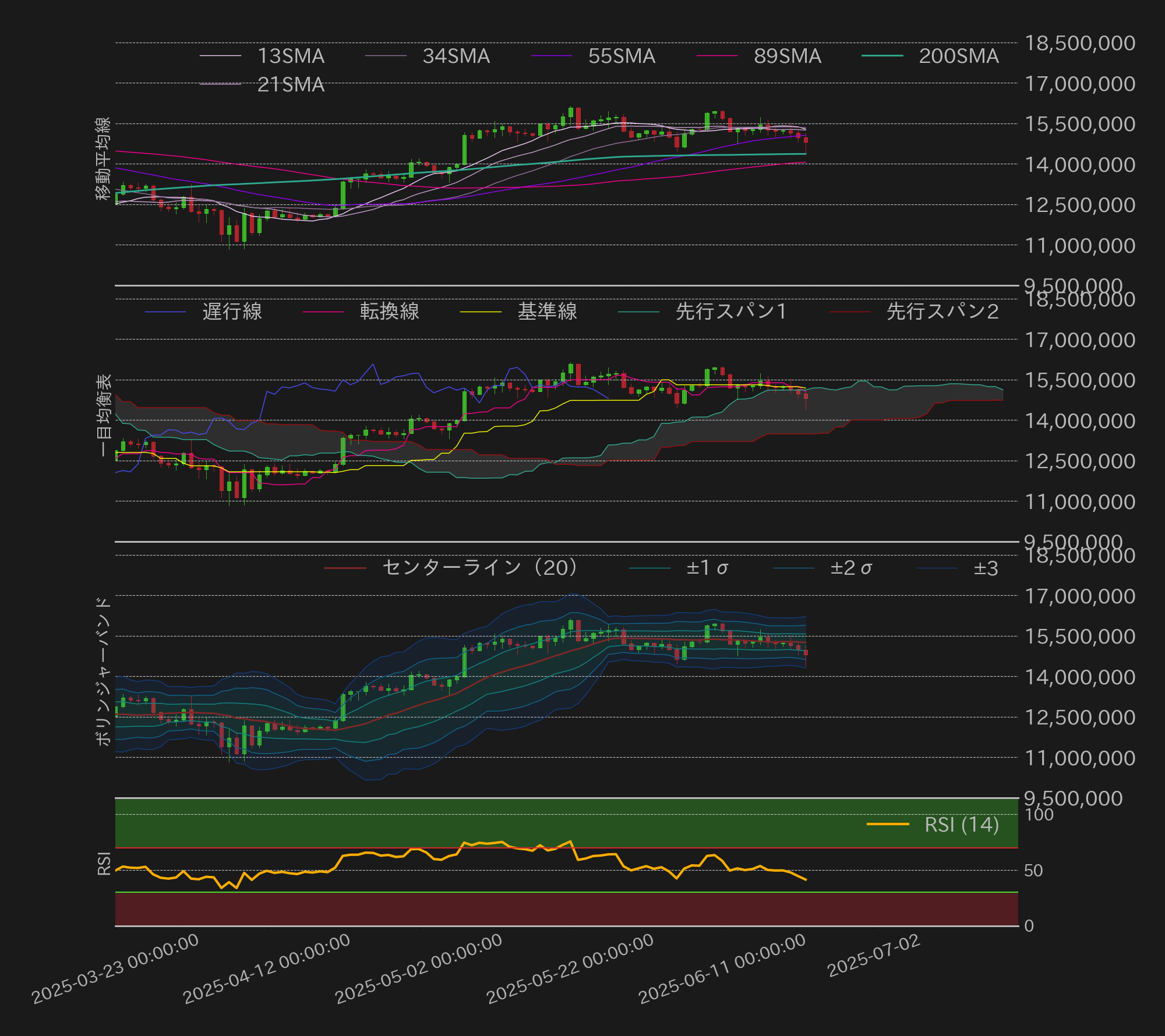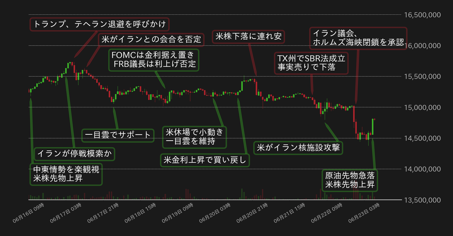 22日未明には、米テキサス州(TX)で戦略的ビットコイン備蓄(SBR)法が知事の署名により成立すると、事実確定売りが入り1500万円を割り込むも、その後米国が3つのイラン核施設に奇襲爆撃をしたと報じられると、若干の買い戻しが入り、1500万円での揉み合いに転じた。しかし、夜になるとイラン議会がホルムズ海峡の封鎖を承認したことで地政学リスクや世界経済の先行き不透明感から売りが強まり、BTCは1450万円周辺まで一段安を演じた。