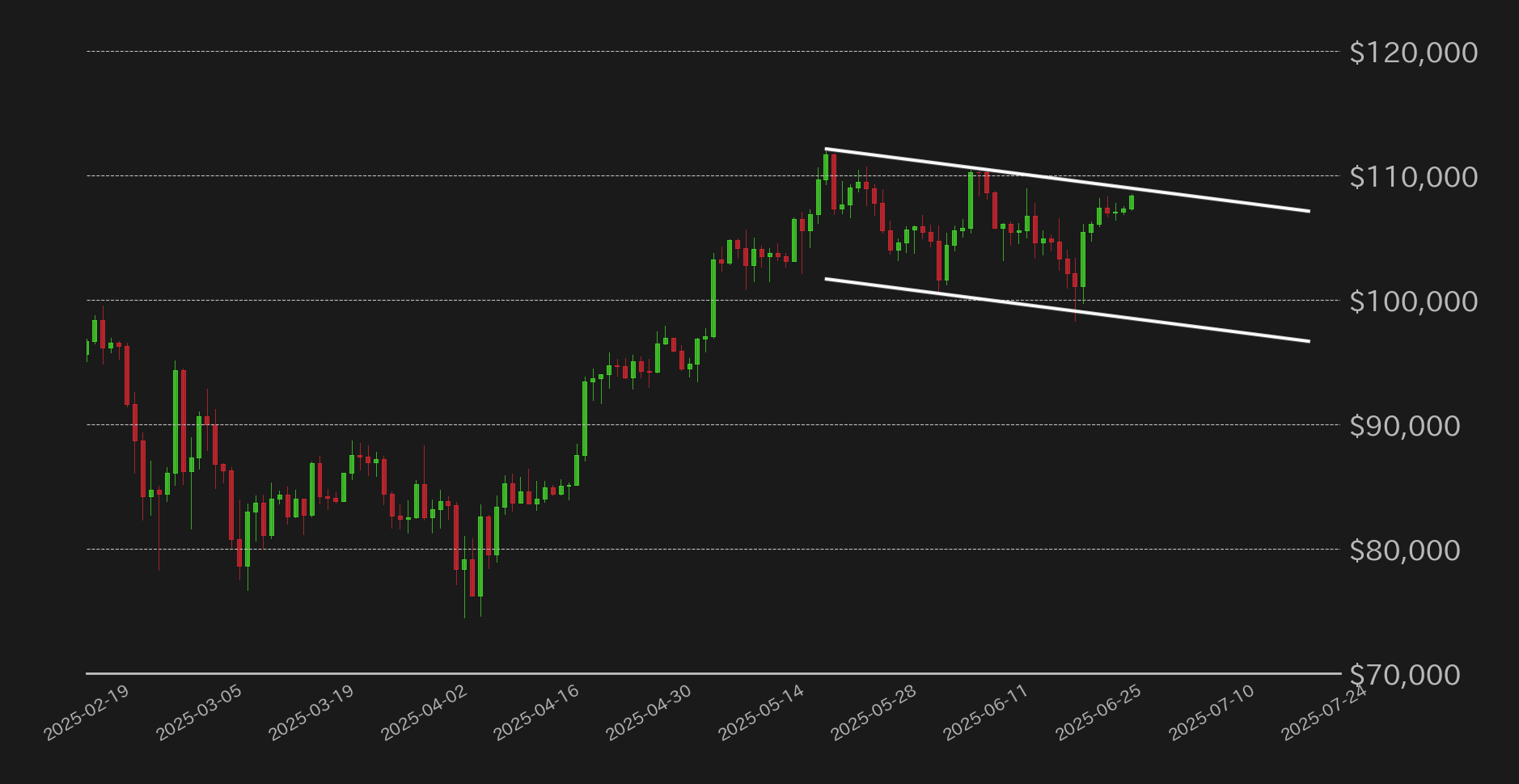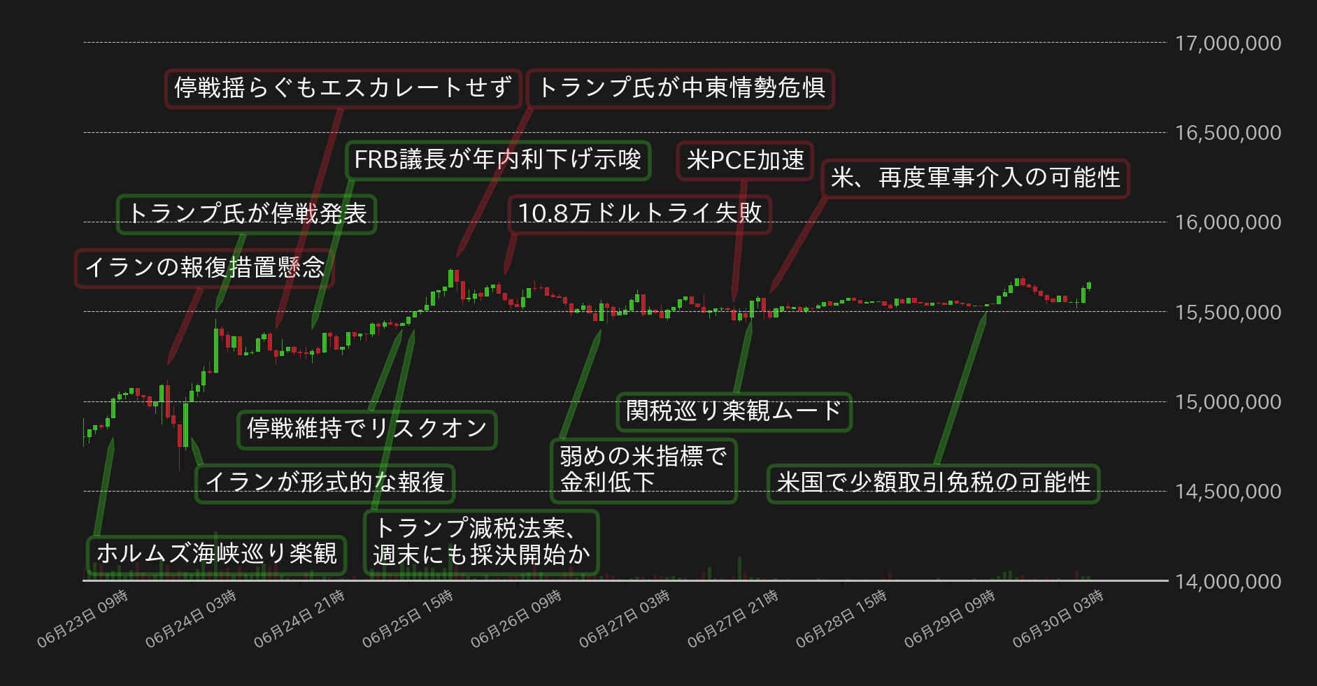 中東情勢を巡る地政学リスクの後退で先週前半のBTC円は1460万円から一時1570万円を回復した。一方、週央からはドル建てで10万8000ドルを背に上げ渋りに転じ、小動きに終始した。27日には、5月の米個人消費支出(PCE)デフレーターが前年比で加速したが、トランプ政権が相互関税の交渉期限を延長する可能性を示したことで米国株相場が上昇し、BTCの下値も支えられた。